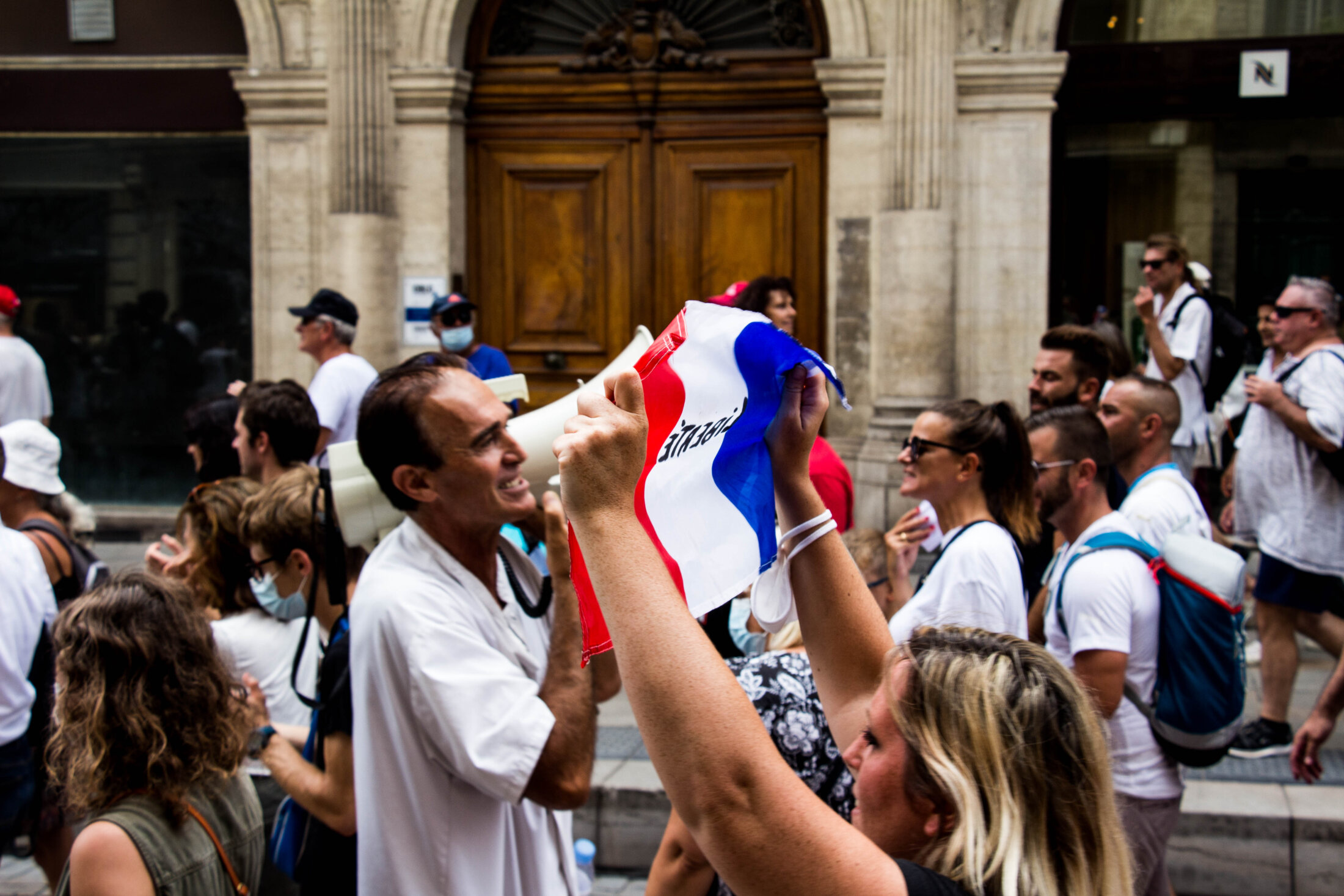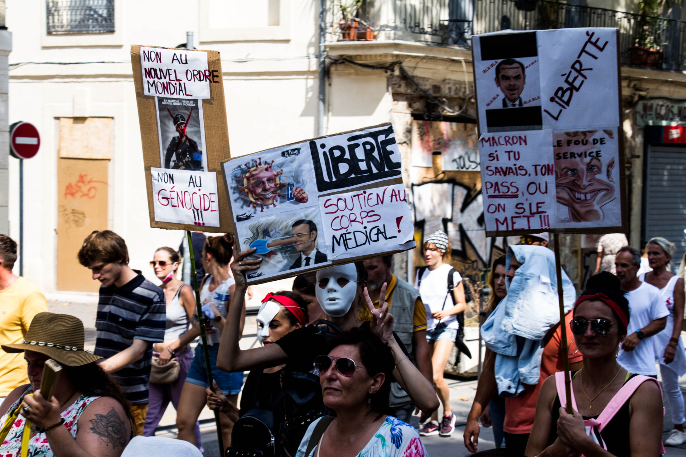 Des figures commencent à émerger de ces rassemblements où l’on constate une majorité de primo-manifestant·es dont la diversité sociale est frappante, et qui évoluent parmi de nombreux Gilets jaunes, des soignant·es, mais aussi des antivax ou des mouvements de « ré-information » tels que Reinfocovid. Si certains slogans présents sur les pancartes vont parfois d’assertions complotistes en références douteuses à l’Allemagne nazie ou à la Résistance, la foule s’accorde cependant autour de quelques mots d’ordre unis : « Liberté ! », « Le pass sanitaire, on n’en veut pas ! » ou encore un déroutant « Aaaa-a Anti, Anti Pass sanitaire ! Aaaa-a ! »