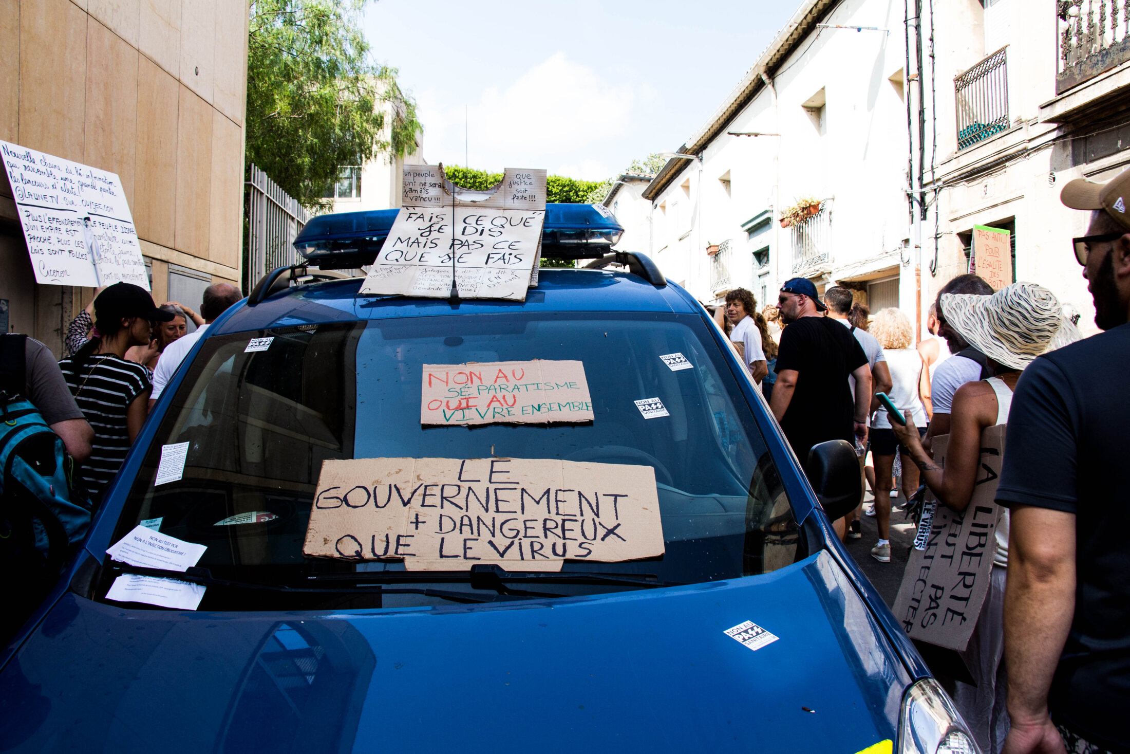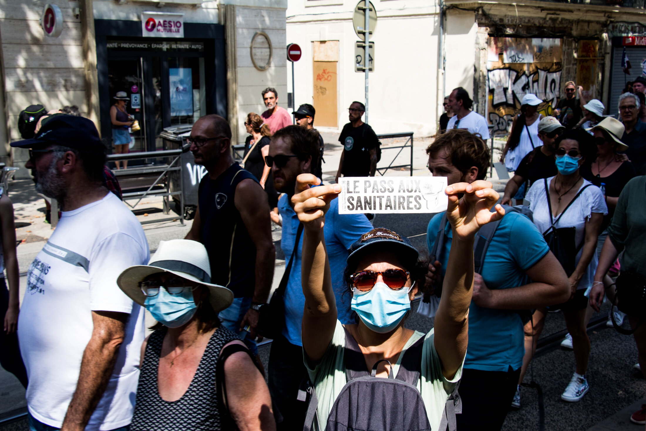 Serions-nous à l’aube d’un nouveau et massif mouvement social spontané en France ? La question mérite d’être sérieusement posée après ce second samedi de mobilisations partout dans l’Hexagone (161 000 manifestant·es selon les chiffres officiels), et alors que la manifestation qui s’est tenue à Montpellier a réuni environ 7000 personnes au beau milieu de l’été, après les 5000 de la semaine précédente. C’est sur la place de la Comédie et sous une chaleur écrasante que les opposant·es au Pass sanitaire anti-Covid se sont réuni·es en faisant montre d’une détermination certaine. Le cortège a bruyamment manifesté pendant plusieurs heures dans et autour du centre-ville, revendiquant la liberté du choix de se faire vacciner ou non, et dénonçant la gestion autoritaire de la crise sanitaire par le gouvernement d’Emmanuel Macron.