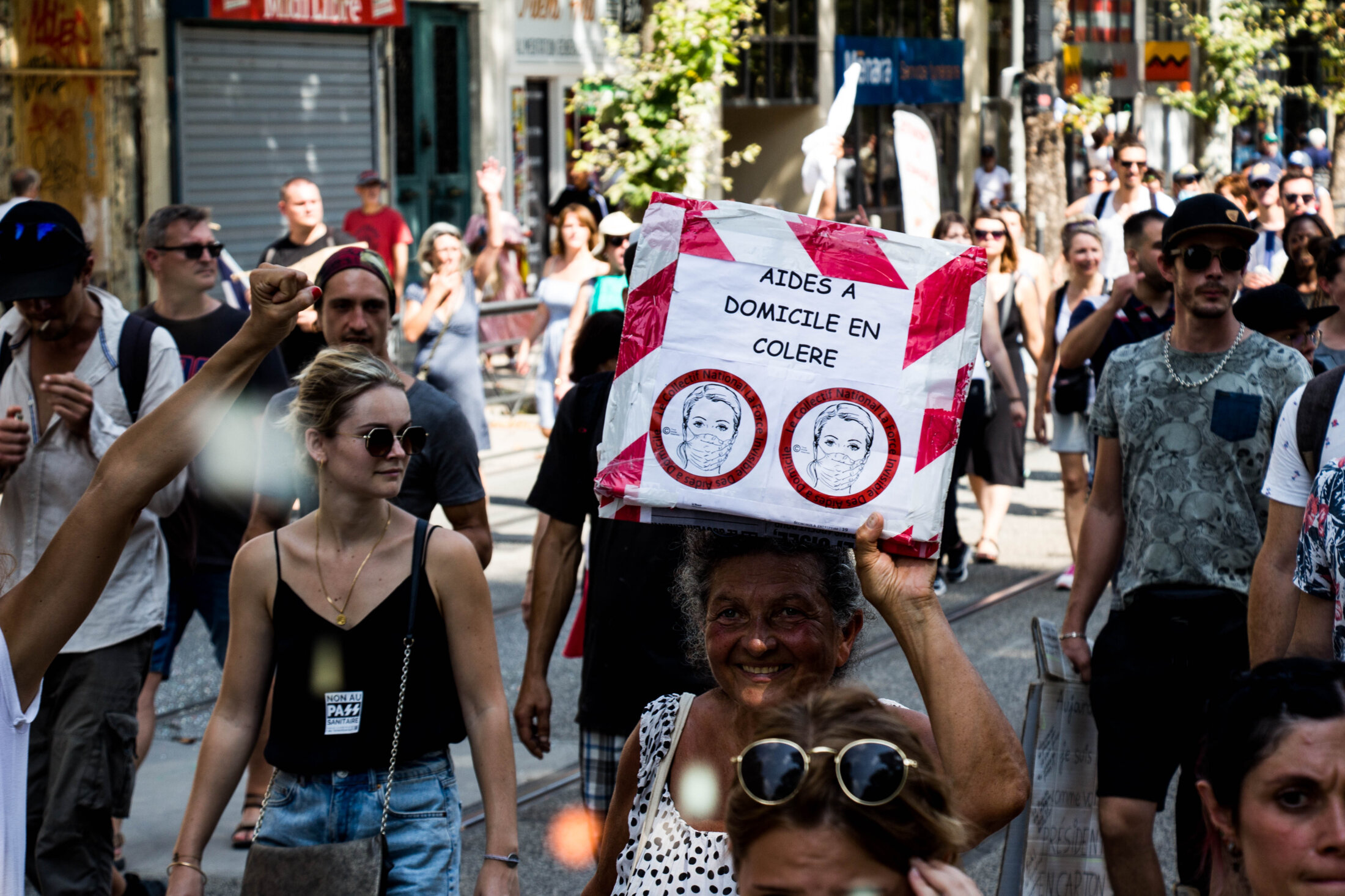 Mais que penser – ce mouvement connaissant ses premières répressions à Paris et dans d’autres villes – de cette omniprésence de drapeaux français, de la devise « Liberté, Égalité, Fraternité », et notamment de ces « La police avec nous ! » ? À Montpellier, comme à l’aube des Gilets jaunes : pas encore de violences policières, et une foule globalement très pacifique, bienveillante, patriote. Ces premières secousses de la France en colère contre la gestion sanitaire prennent parfois des airs de début du mouvement fluo, mais sans le ferment socio-politique anticapitaliste évident qui en avait fait l’étincelle du renouveau du mouvement social. Et c’est ce qui interroge, pour la suite de ce mouvement anti Pass sanitaire.
