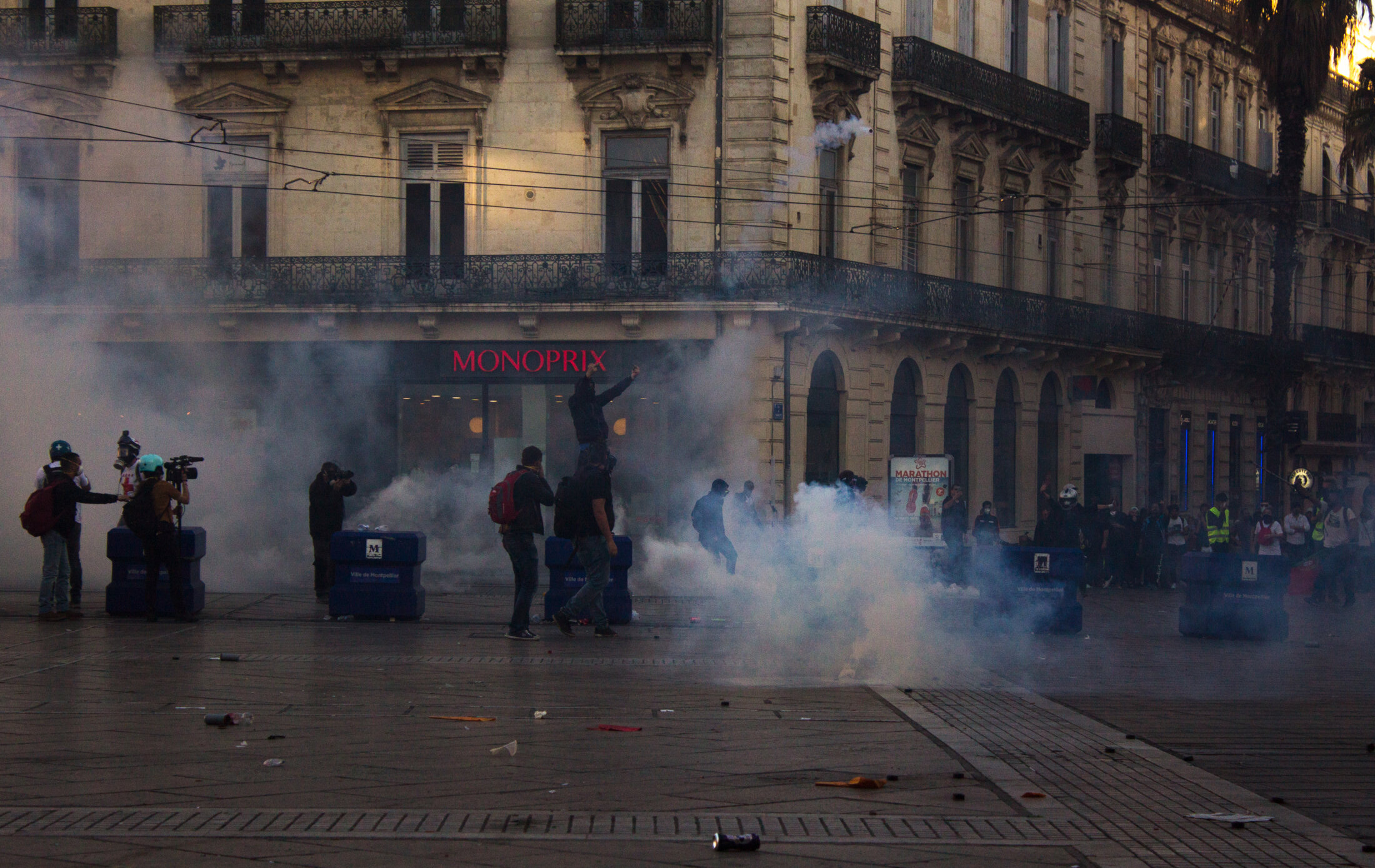 On finit par remonter sur la place de la Comédie, et là stupeur. Des lignes de CRS viennent rapidement cerner l'espace et faire face aux manifestants. La foule se compacte et s'avance. Des insultes fusent depuis le black bloc, quelques projectiles légers. Et l'assaut est donné, immédiatement. Les CRS larguent des grenades lacrymogènes et assourdissantes, faisant reculer plusieurs milliers de personnes qui ne s'attendaient aucunement à être dispersées après seulement une heure de manifestation, à 15h15. Les forces de l'ordre ont cette fois brisé le rituel habituel de la place de Préfecture, qui permettait aux manifestants les plus fragiles ou sans protection de s'extraire du cortège avant que celui-ci ne soit dispersé. Alors voilà, tout le monde est gazé. La place se transforme en véritable champ de bataille, avec un black bloc et des gilets jaunes contestataires qui résistent, font reculer plusieurs fois les CRS, qui reviennent chaque fois en force. Les LBD40 sont de sortie, tout comme les GLI-F4 et les grenades assourdissantes. En face, des pierres, des bouteilles, des bocaux de peinture, quelques cacatov qui fendent les airs et s'éclatent sur les boucliers ou sur le pavé. On se croirait au milieu d'une scène de guerre. Ça pète de partout, au beau milieu des badauds qui n'avaient rien à voir avec la manifestation et se trouvaient là soit par hasard, soit par curiosité.