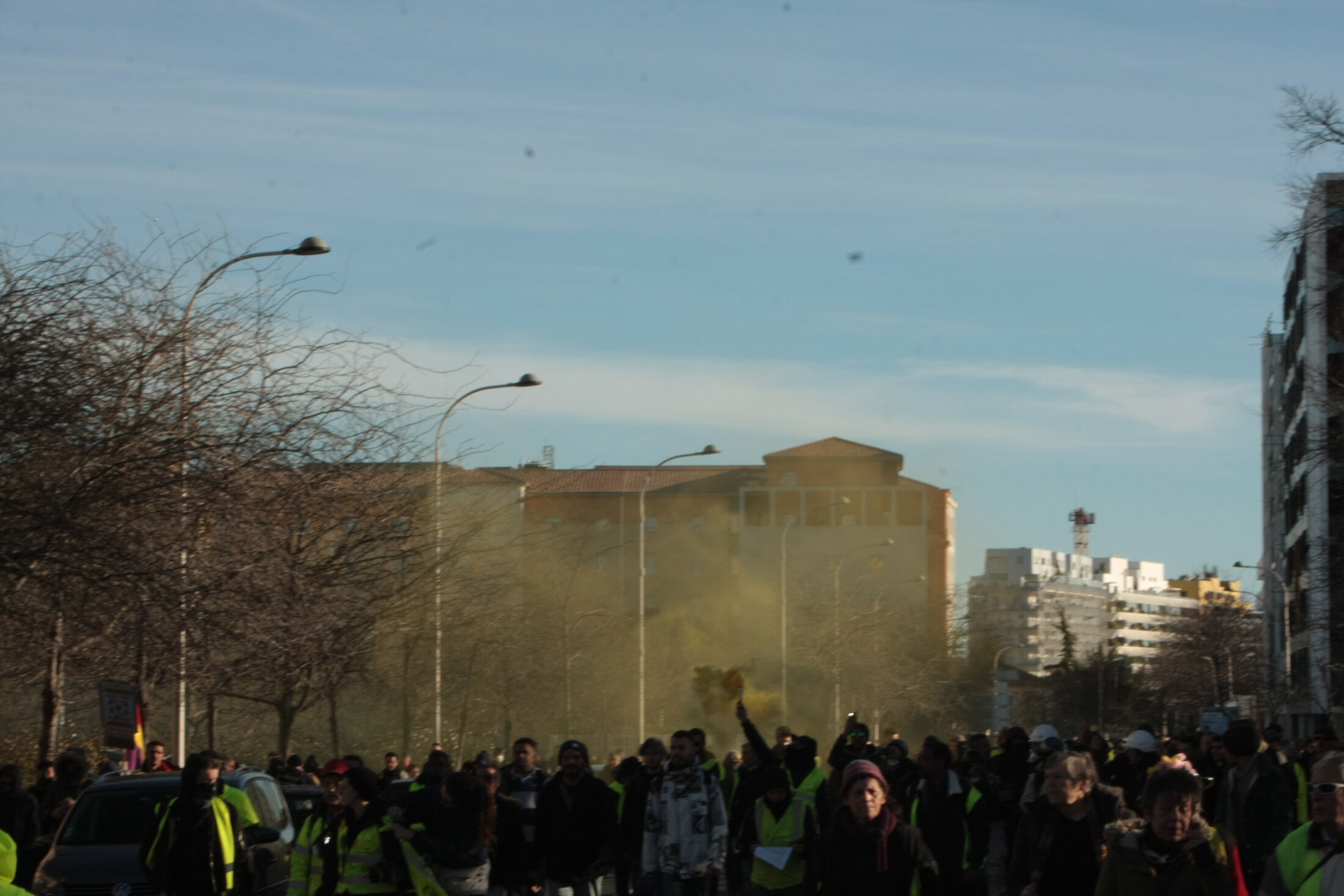 14h. Un petit millier de personnes se rassemble sur la place de la Comédie, en ce samedi 26 janvier inhabituellement chaud, mêlant les éclats fluo de leurs gilets de sécurité à la pierre jaune durement frappée par le soleil. Dans la foule, les visages reflètent tous les âges, tous les parcours. Si certains sont déjà masqués sous d'épais foulards noirs ou plus rarement des masques de protection, la plupart des gens se sourient librement, échangent clins d'œil et regards de connivence tout en discutant des sujets de convenance : gilets jaunes, grand débat, répression, hyper-capitalisme, pouvoir d’achat... L'ambiance est plutôt festive et bon enfant, de petits groupes plaisantent, affublent de noms d'oiseaux les membres du gouvernement ou se lancent dans des micro-débats enflammés qui refont le monde.