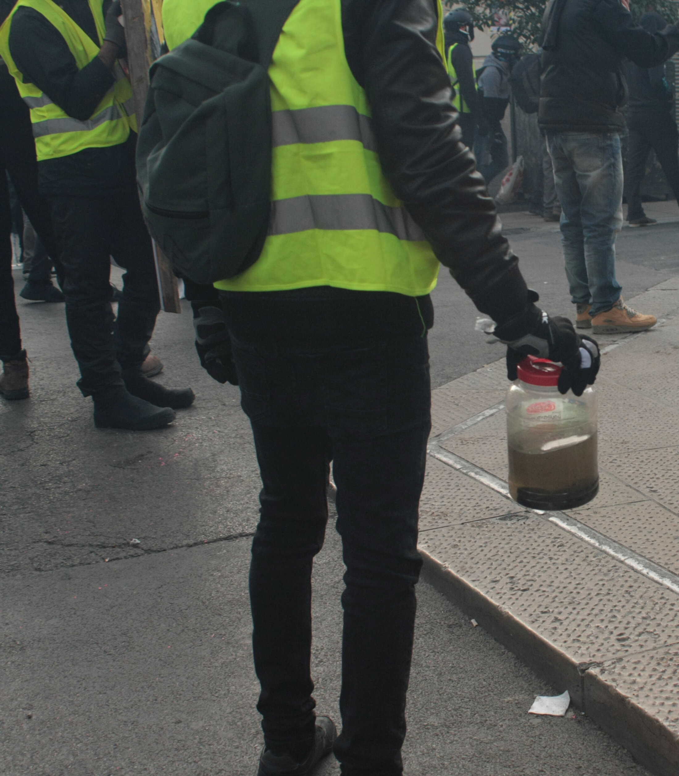 Plusieurs gilets jaunes isolés éclatent d'une colère sourde contre les forces de l'ordre : « On est le peuple ! De quel droit tu nous gazes, fasciste ? ». Un CRS semble un peu étourdi par sa propre grenade lacrymogène, lancée maladroitement. « Alors, ça pique ? Connard! Tous les week-end, tu me le mets dans les yeux ton gaz de merde! Maintenant tu vois ce que ça fait! » « Ah, bravo les gars ! Bravo ! La fine équipe ! »