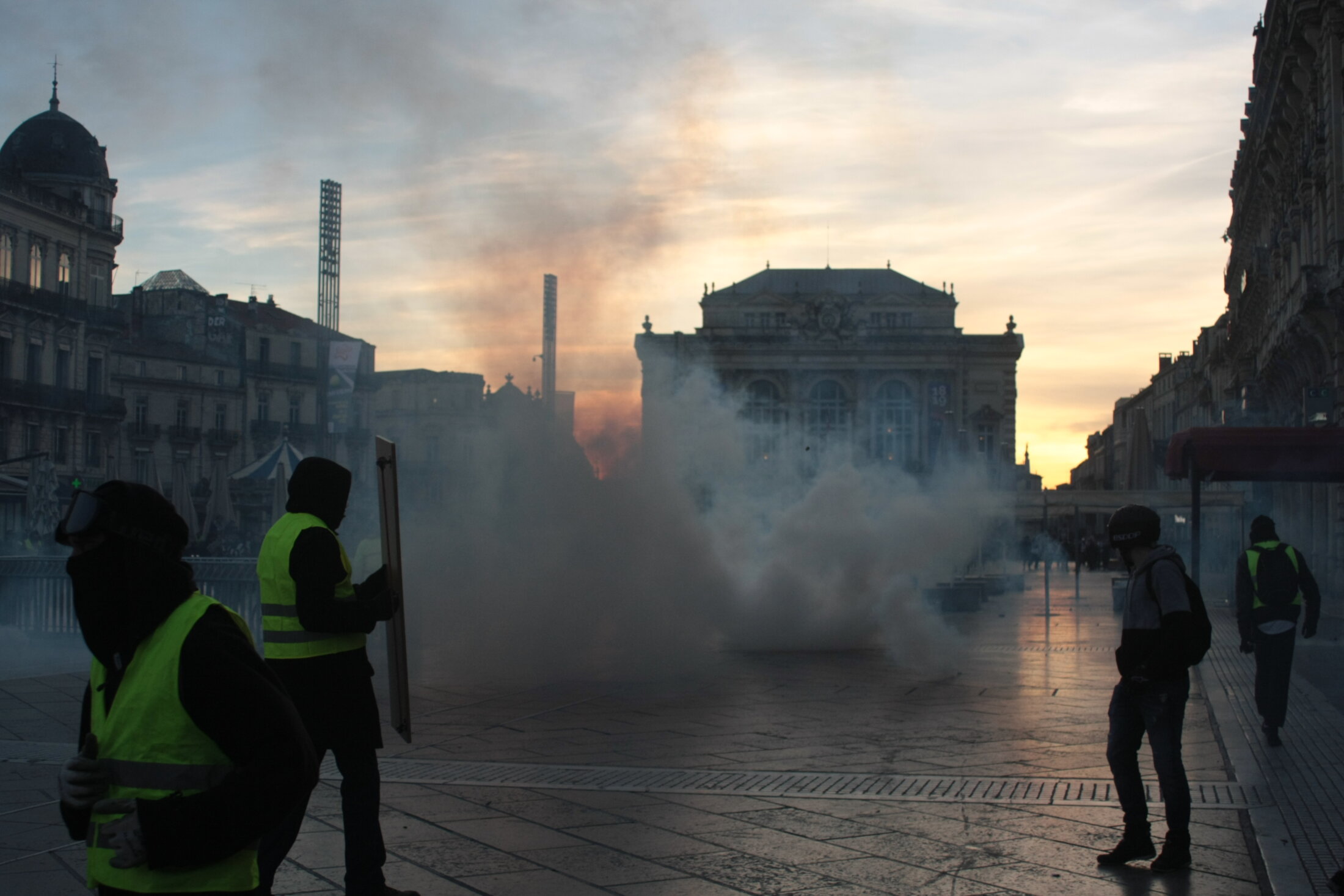 Rapidement, la place est submergée par le gaz lacrymogène tandis que résonnent les explosions des grenades et des cris hargneux des manifestants qui reculent lentement vers la place de la Comédie. Les street-médics sont à pied d'œuvre pour asperger de maalox ceux qui ne s'attendaient pas à la violence du gaz, qui irrite très fortement cloison nasale et gorge, provoquant des pleurs incessants et douloureux. Des gilets jaunes qui participaient sans protection à la manifestation semblent littéralement fous de rage de s’être faits expulser et entrent à leur tour dans la violence, devenant plus virulents à chaque vague lacrymogène qui les prend logiquement de plein fouet. Ils se mêlent au lancer de pavé et à la destruction des terrasses.