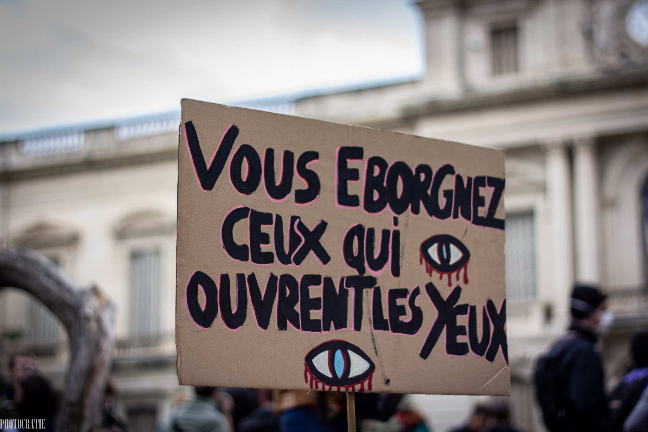 Aussi, après quelques dizaines de minutes festives sur la place des Martyrs de la Résistance, c’est en manif’ sauvage que sont reparti·es des milliers de manifestant·es, descendant le boulevard du Jeu de Paume jusqu’à la gare Saint-Roch, déterminé·es à retourner devant l’Hôtel de police pour exprimer leur colère, alors que l’espace médiatique a été saturé de violences policières toute la semaine. L’évacuation du campement de réfugiés de la place de la République et l’ignoble agression de Michel Zecler à Paris ont sans aucun doute contribué à l’ampleur de la mobilisation à l’échelle nationale. Plus de cent rassemblements étaient en effet annoncés partout en France.