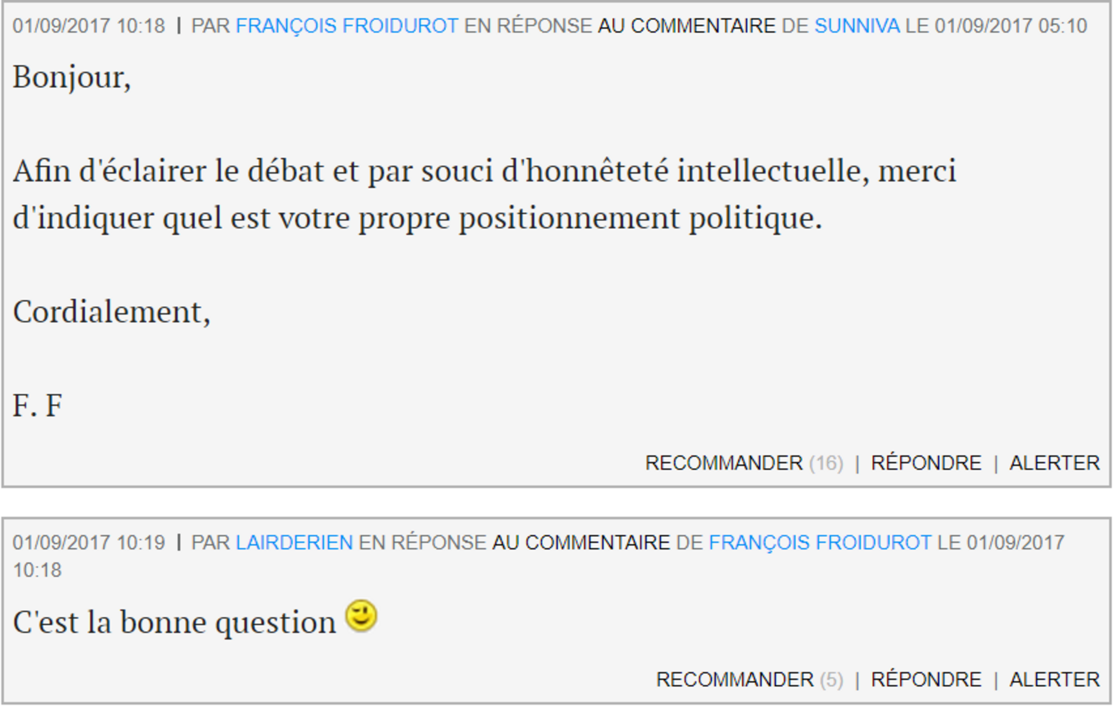 Outre, on l'a vu, que la réponse à la question posée par François Froidurot figure clairement dans les premières lignes du billet, la réponse à cette nouvelle question, concernant le signataire du billet, (lui ou elle ?) figure, tout aussi clairement, à la fin...