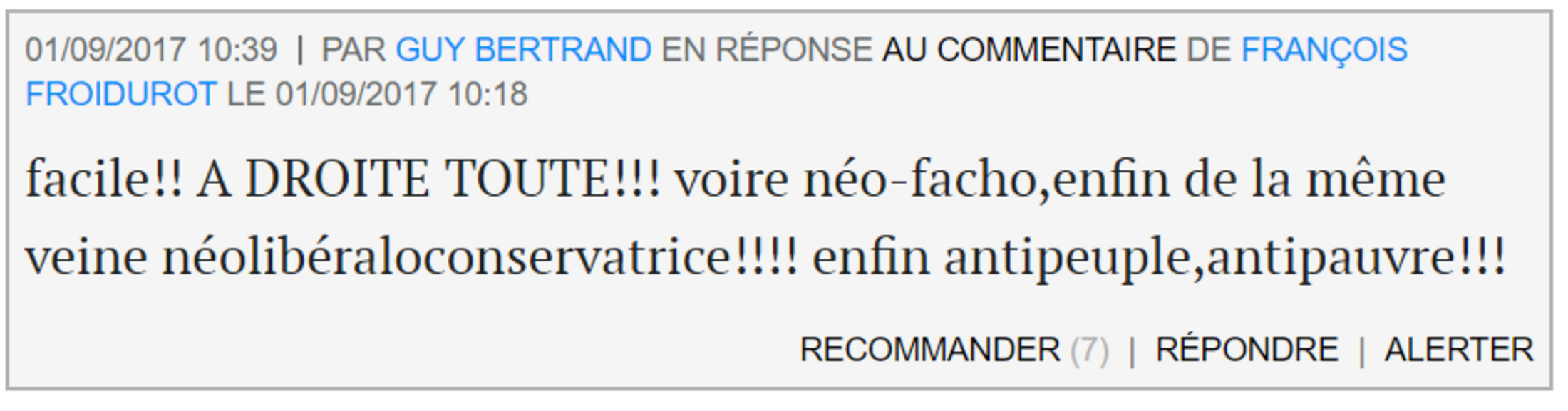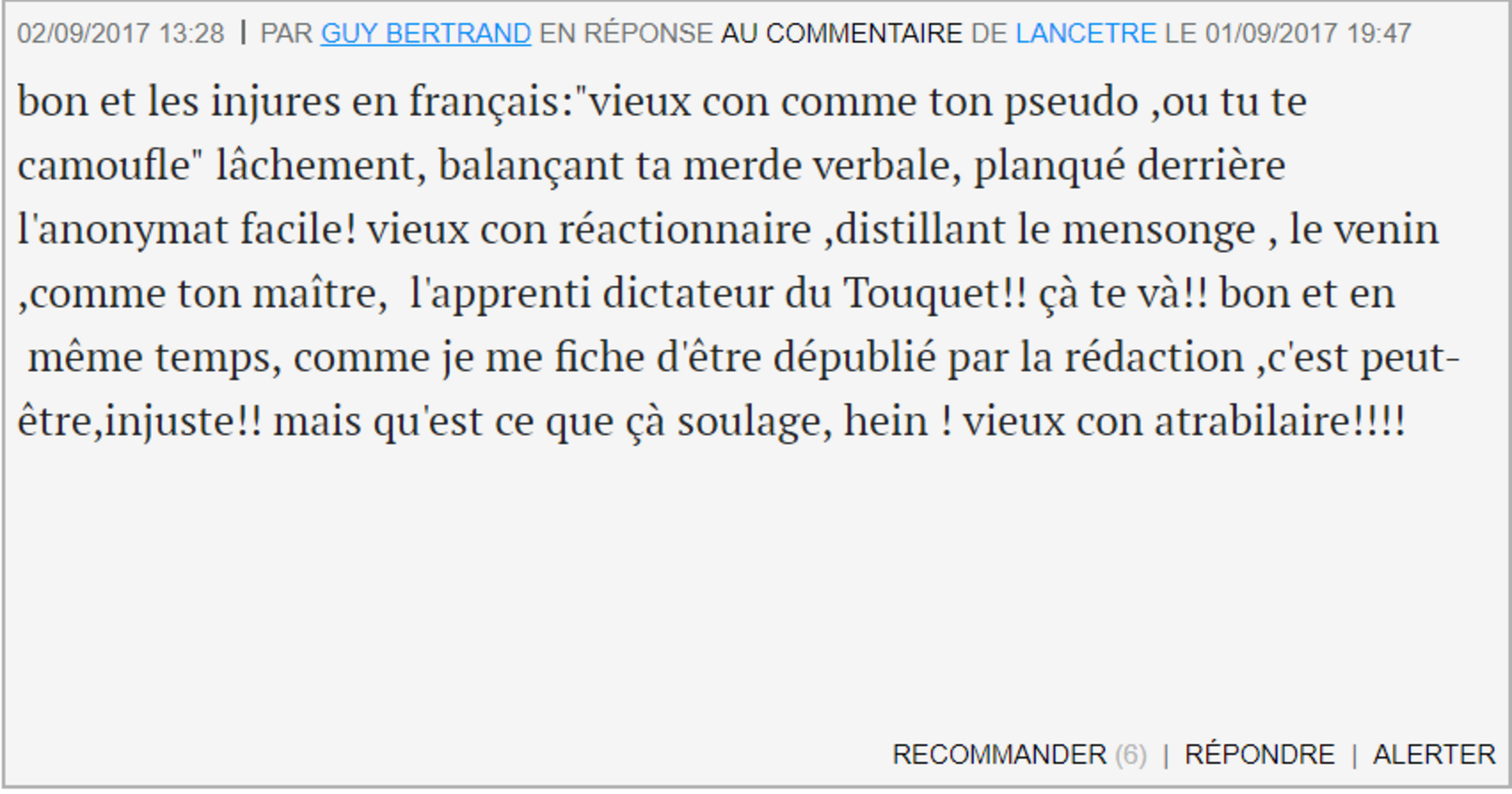 Il y en a même qui, n'ayant pas davantage lu le billet, surenchérissent, et passent directement à l'injure grotesque: