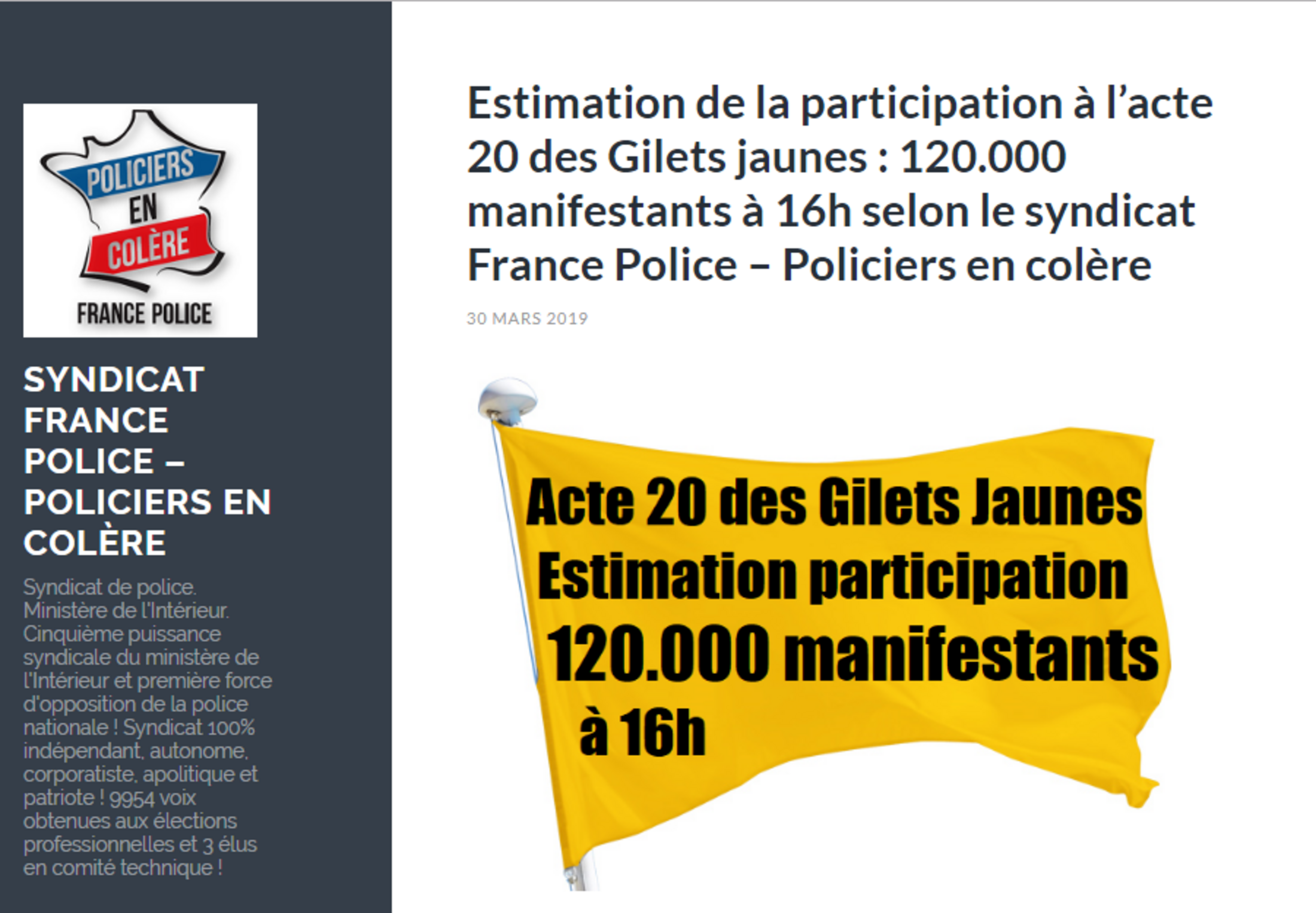 Notons également que France Police est la seule entité qui propose un décompte des manifestants depuis le début du mouvement. Leurs chiffres sont très largement supérieurs à ceux du ministère de l'Intérieur. Le 24 novembre, le syndicat avait ainsi recensé un million de manifestants, contre 81.000 selon les autorités. Le samedi 5 janvier lors de l'Acte 8, le syndicat a estimé la participation à 300.000 manifestants, contre 84.000 selon Beauvau. Des chiffres qui ont un certain succès sur les pages des réseaux sociaux proches de Gilets jaunes ou se revendiquant comme tel. Le dernier comptage a également été partagé par des pages internet bien plus sulfureuses comme le site de Salim Laïbi, un militant complotiste et antisémite qui a été un temps poche d'Alain Soral avant de se brouiller avec lui.