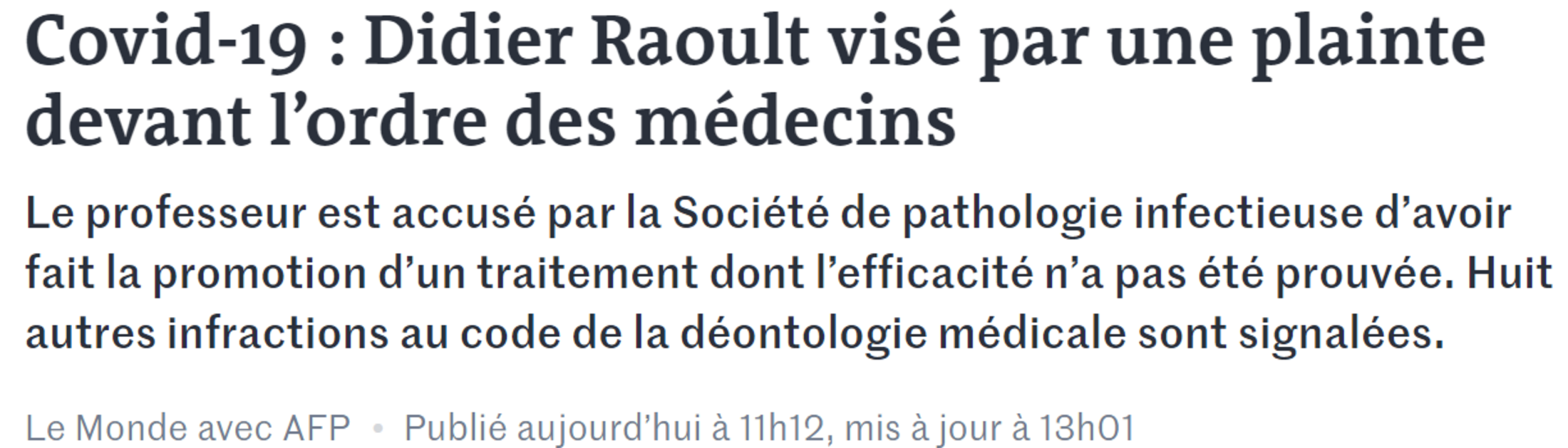 Un autre avis sur Didier Raoult, qui fait à présent l'objet d'une plainte, soutenue par des centaines de médecins, devant le Conseil de l'Ordre: