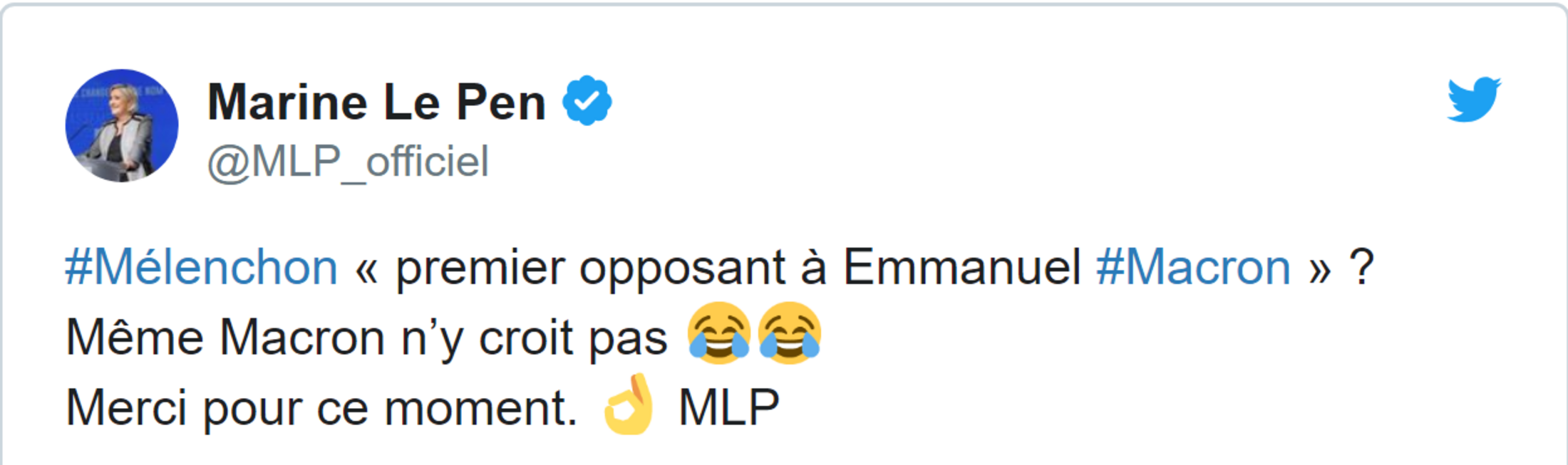 En faisant ami-ami avec Mélenchon, il le discrédite complètement comme opposant à sa politique, et relégitime donc, dans ce rôle, le Rassemblement National, qui était en fâcheuse posture, sa présidente commençant à fréquenter les cabinets des juges d'instruction avec la même assiduité que Sarkozy, les financements étant bloqués par les juges, beaucoup de militants ne renouvelant pas leur adhésion.