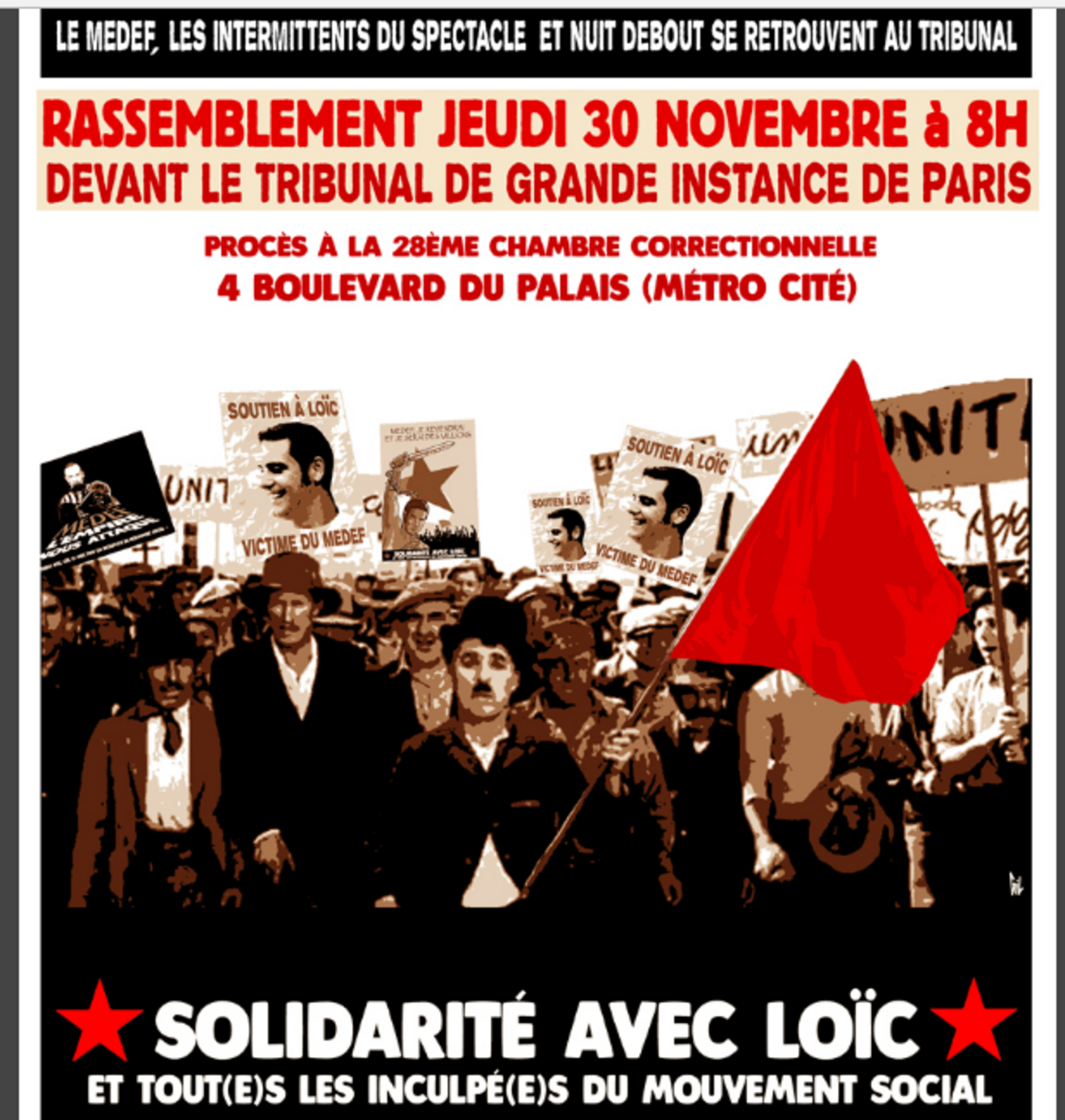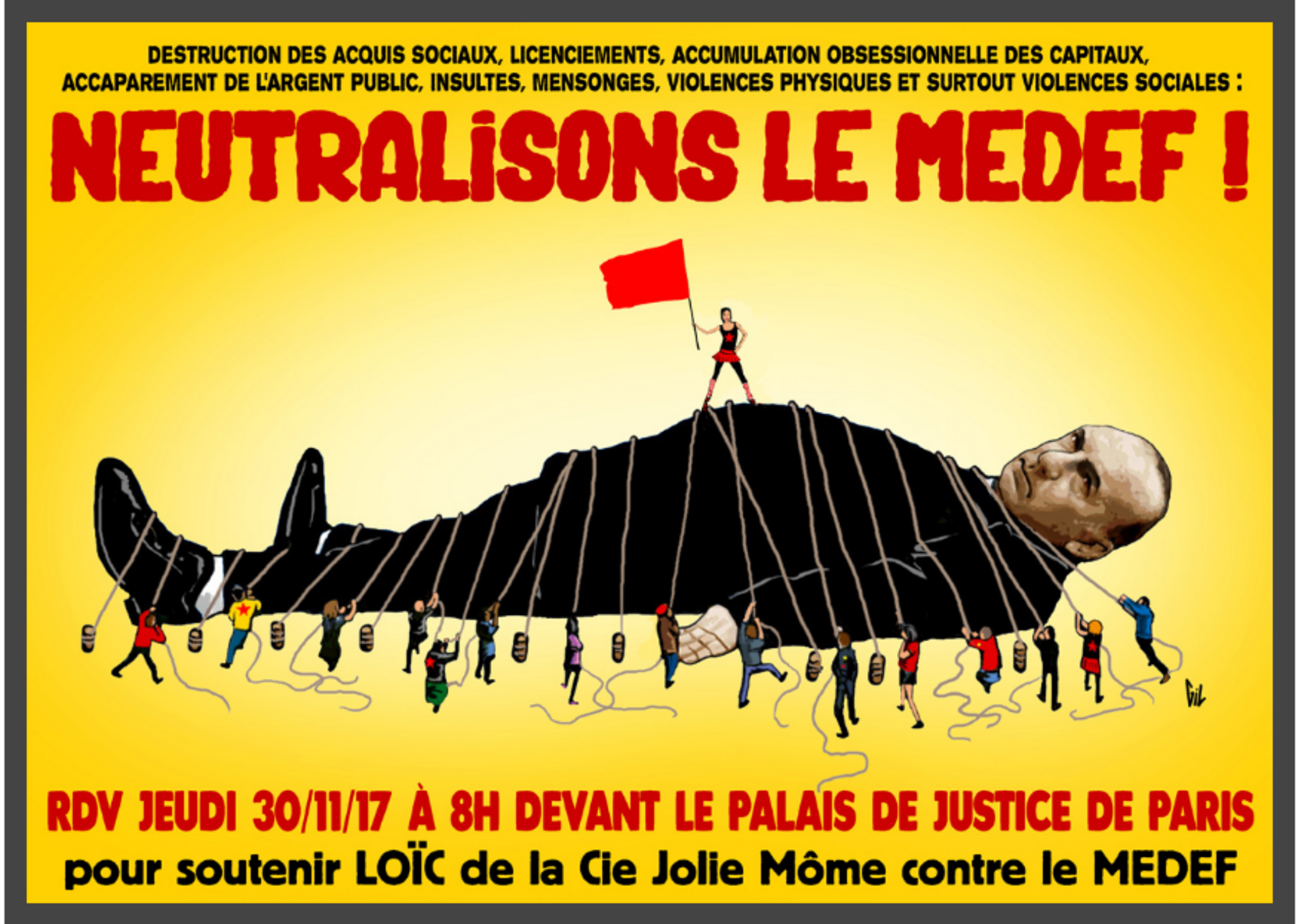 Pour la relaxe de Loïc accusé par le Medef, contre les répressions politiques, pour laséparationdu Medef et de l'Etat : RENDEZ-VOUS JEUDI 30 NOVEMBRE 2017 A 8H devant le tribunal correctionnel de Paris, M° Cité. Retrouvez le texte de l'appel à signer : Droits sociaux, assurance chômage... le Medef nous les brise