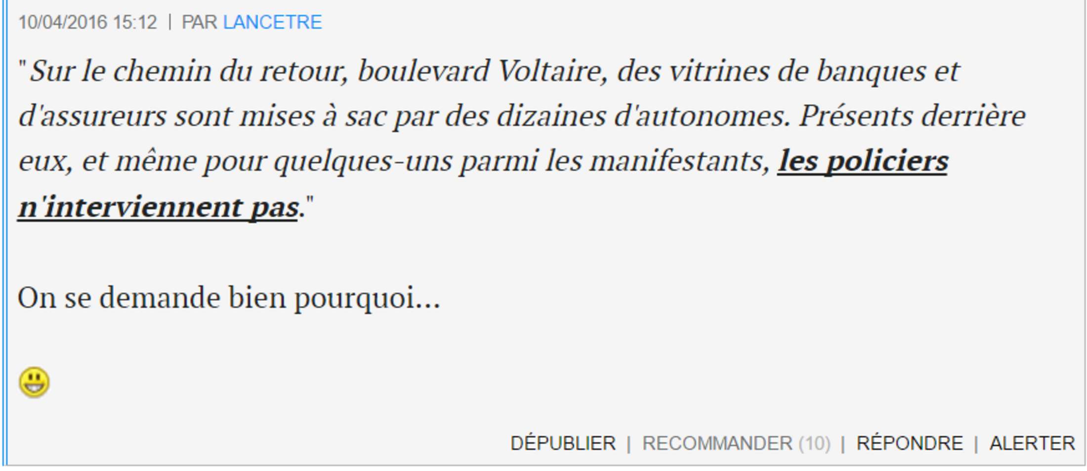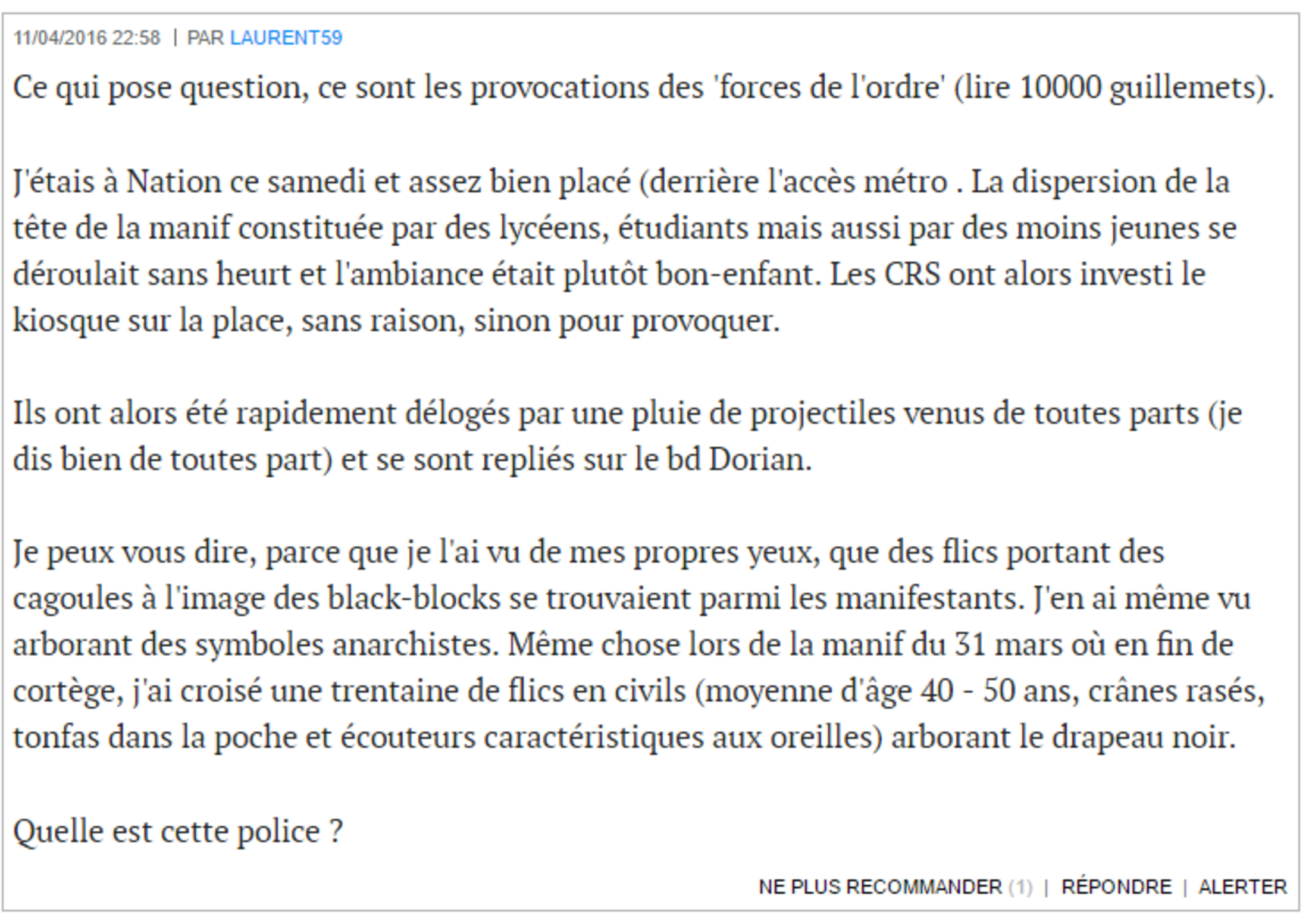 1) à une observation publiée le dix avril, et faite durant la manifestation de la veille, par deux journalistes de Médiapart, observation que j'avais relevée: