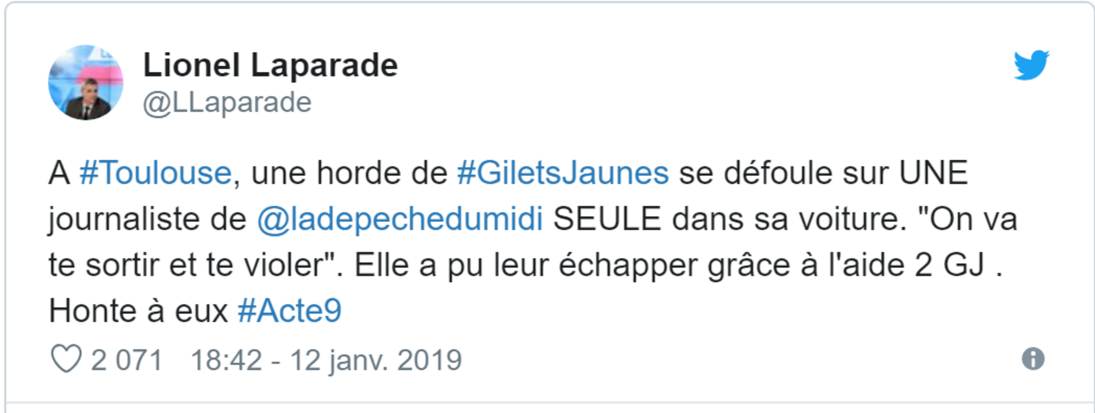 On se demande si ceux qui continuent à défendre ce mouvement hyper-violent, qui ne chante que La Marseillaise, qui n'agite que des drapeaux tricolores, qui injurie et agresse, sans trêve ni répit, les journalistes, qui multiplie quenelles et slogans antisémites et homophobes, prendront un jour conscience de la réalité.