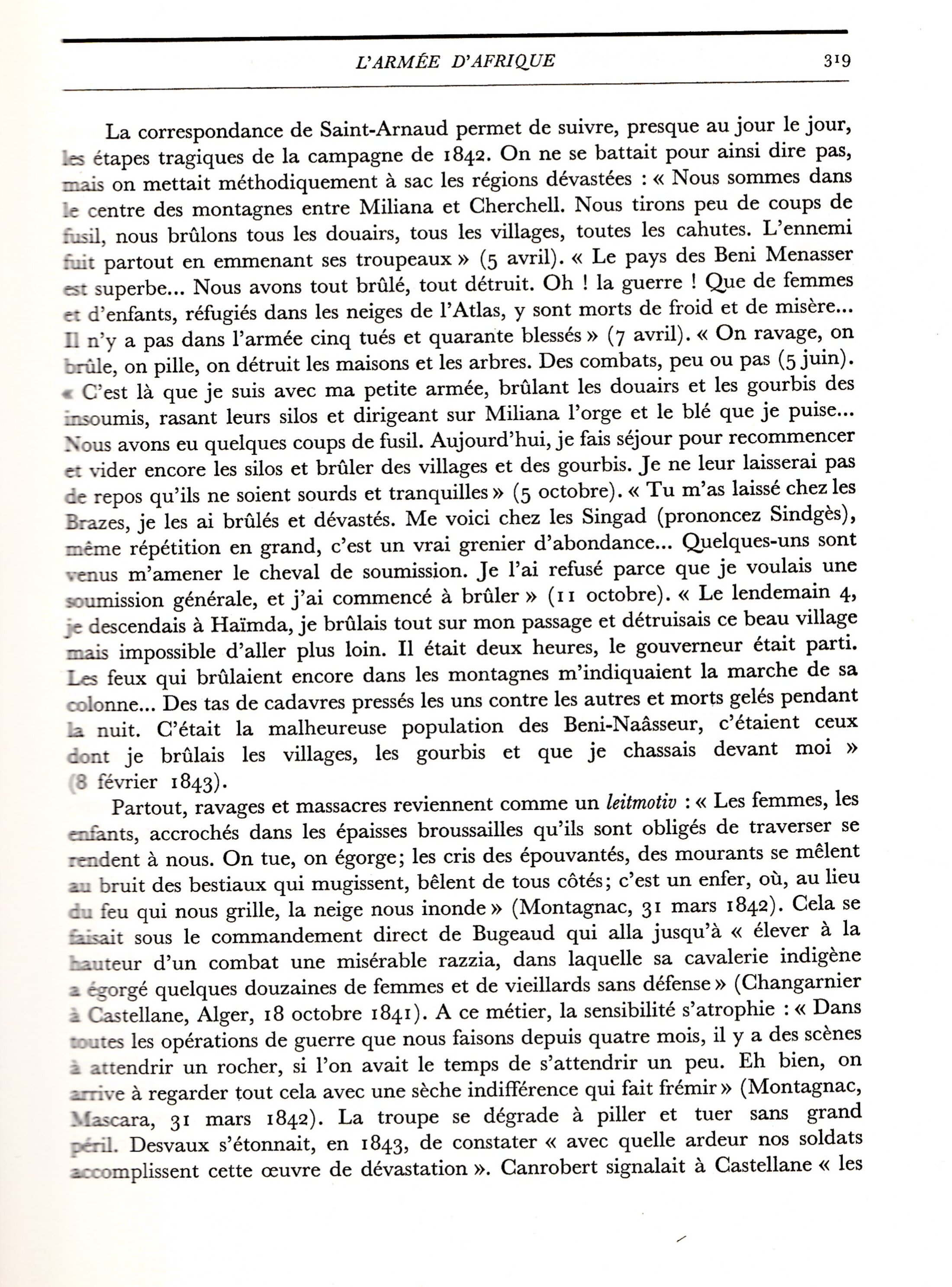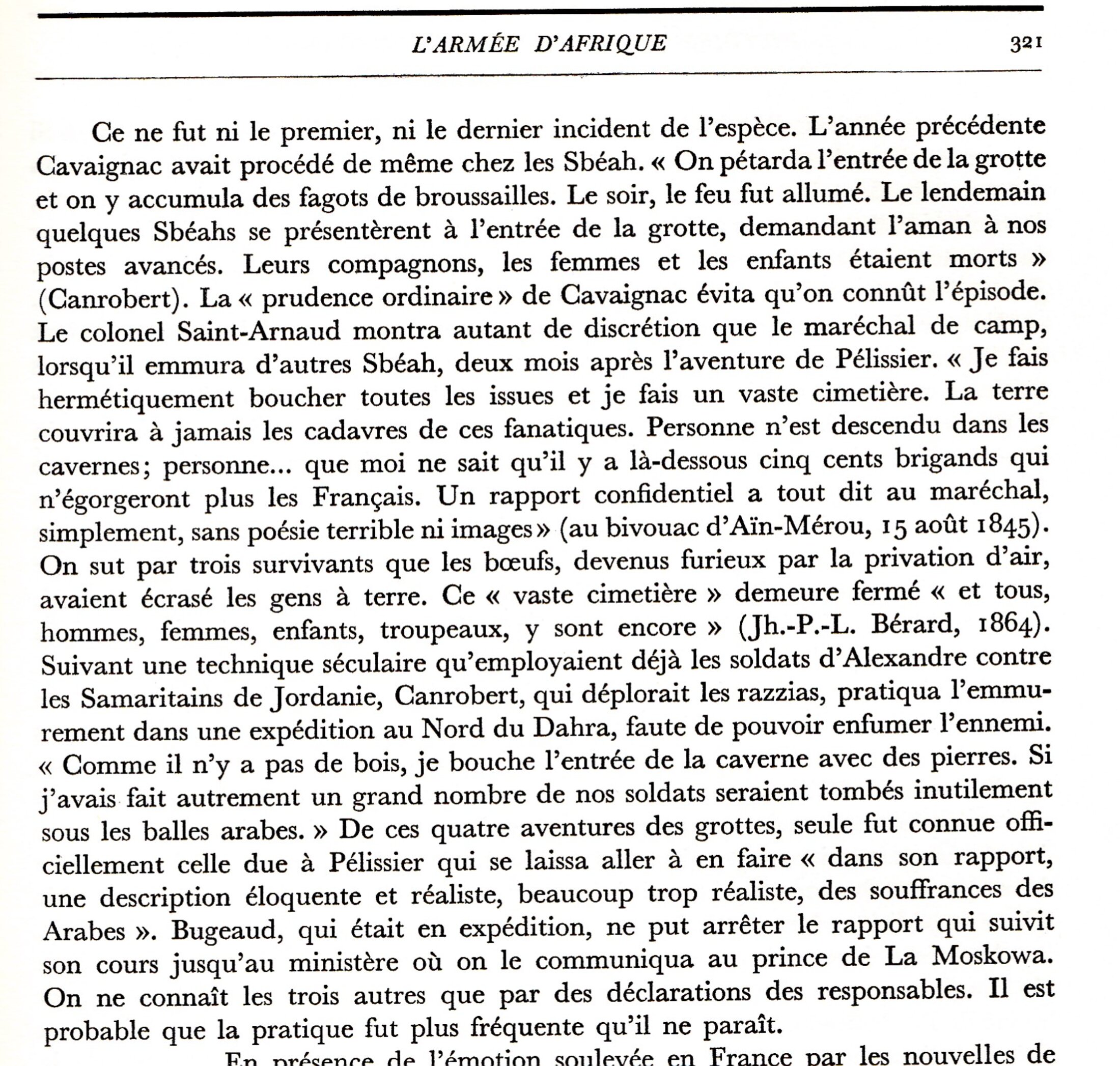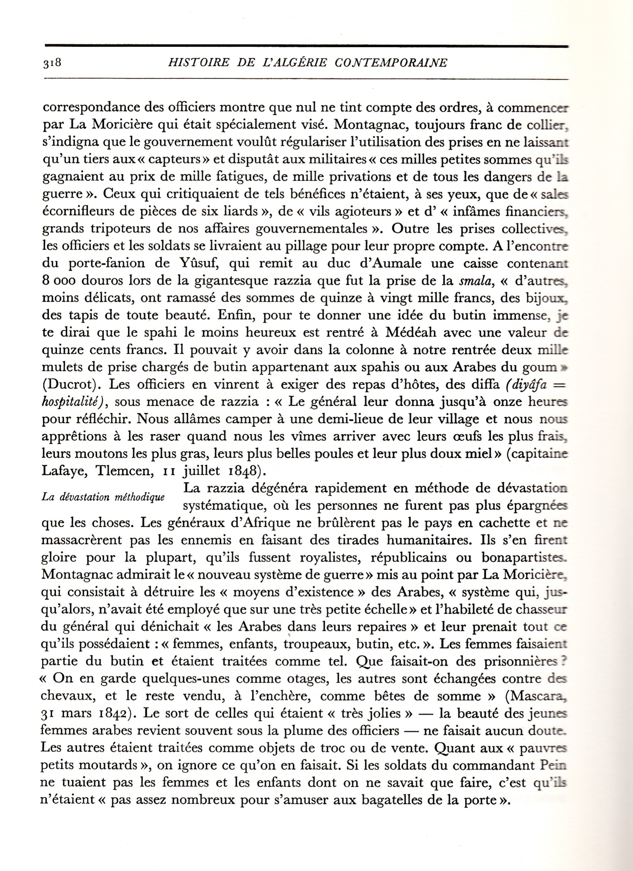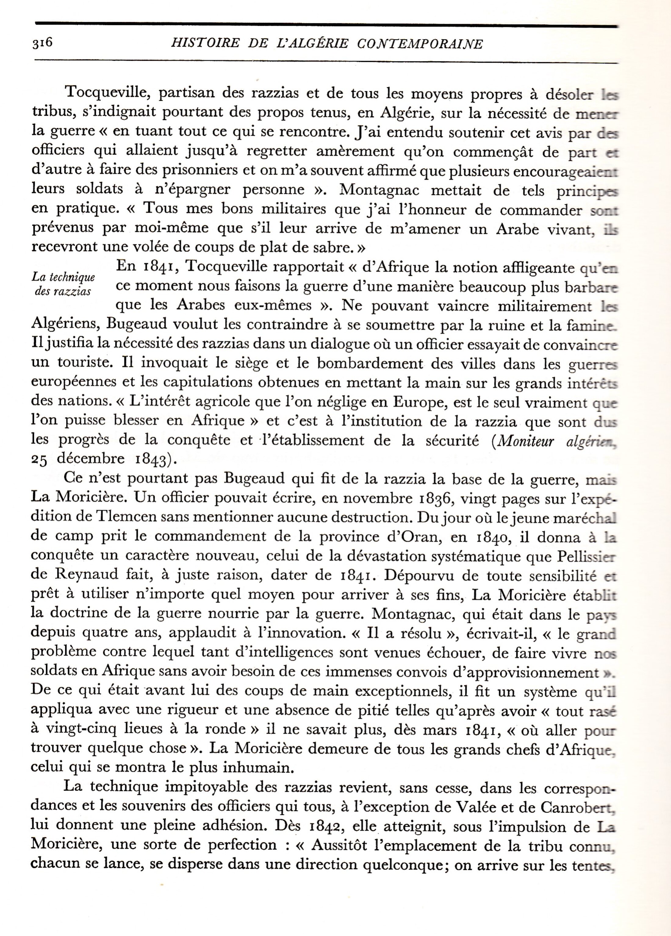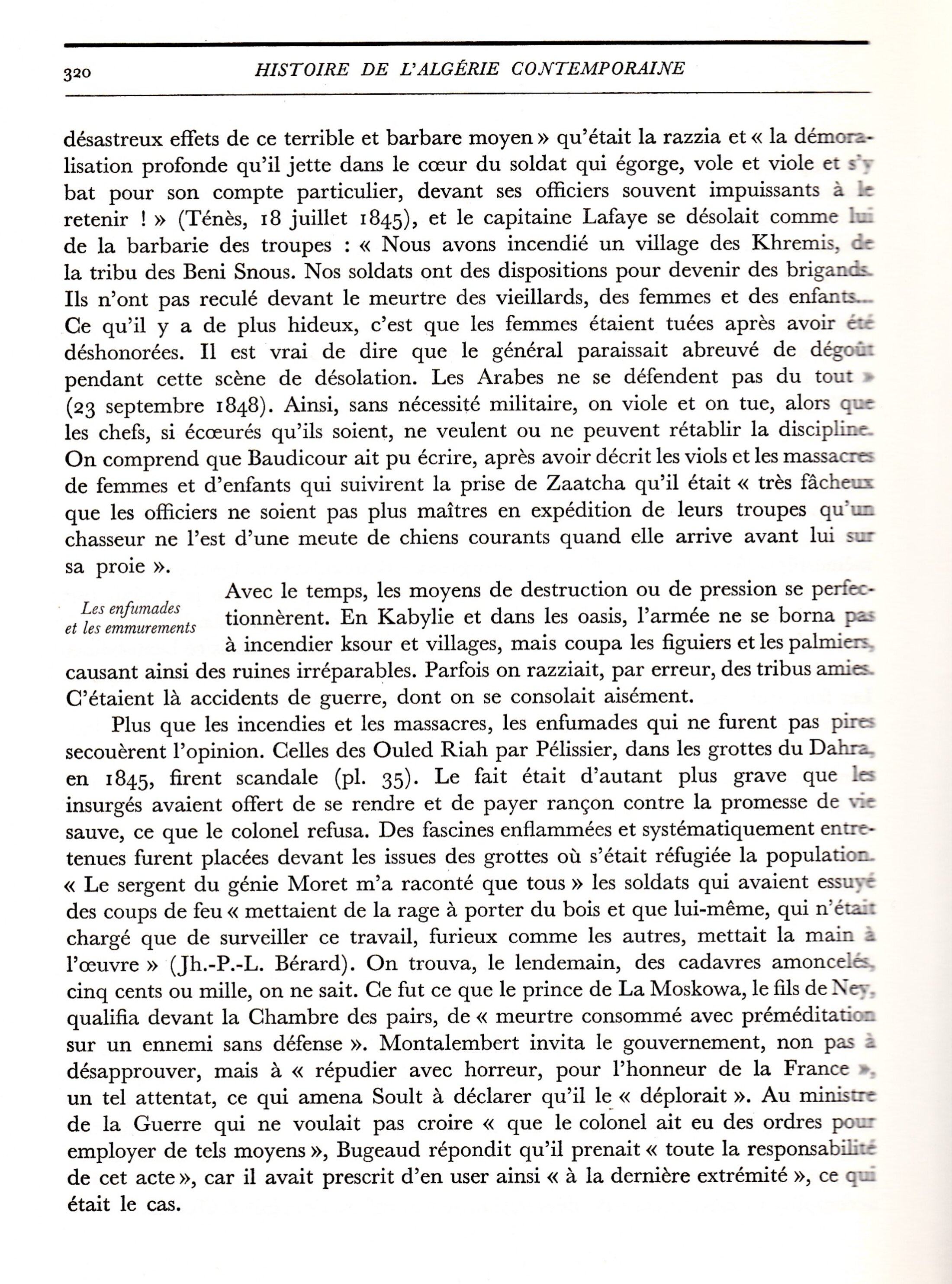 C'est en 1964 que l'historien Charles André Julien publie, aux PUF, le premier volume d'une monumentale Histoire de l'Algérie contemporaine. Cette histoire sera poursuivie par Charles Robert Ageron. A partir des archives du XIX ème siècle, il y raconte, par le menu, la conquête et la colonisation. Les crimes contre l'humanité sont nombreux et documentés.