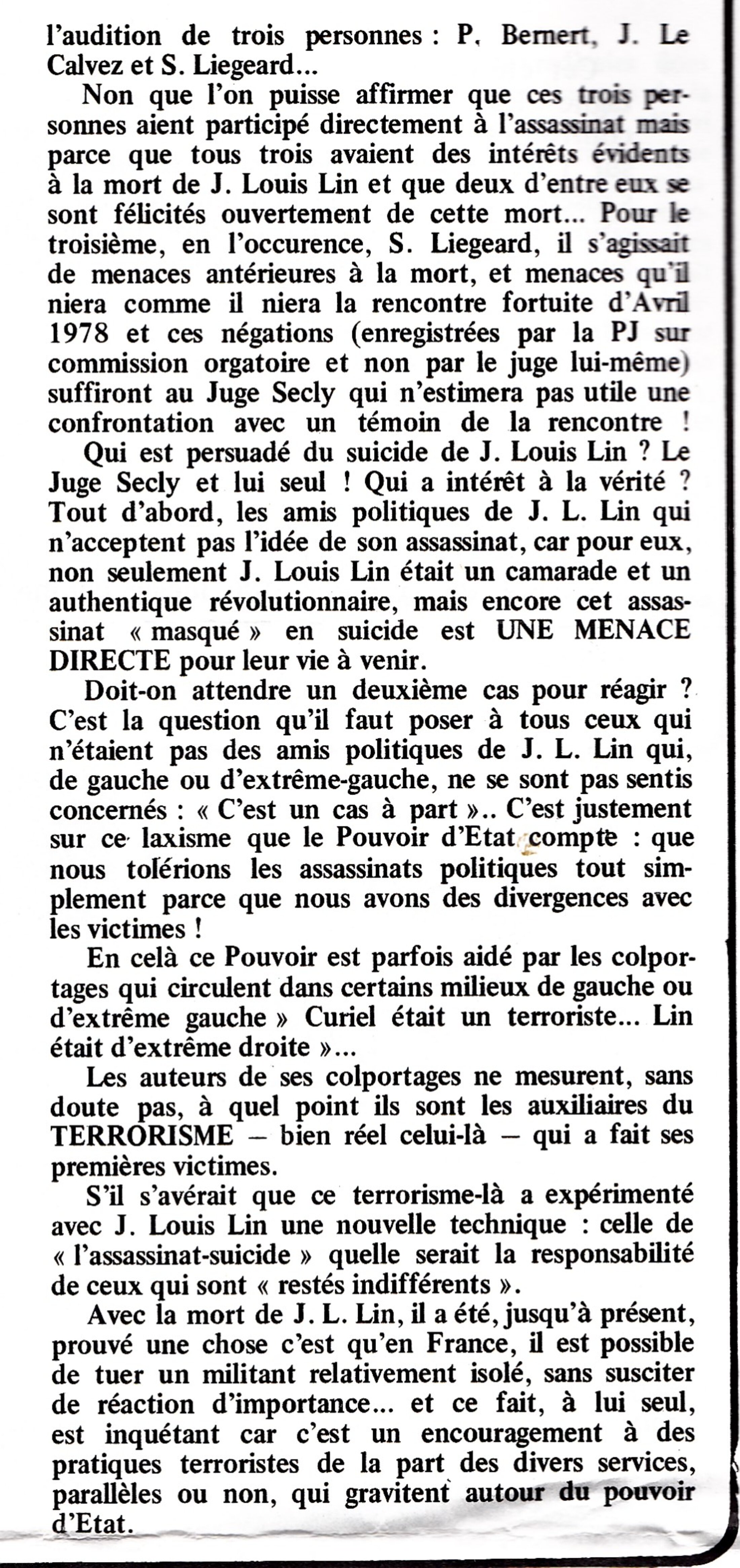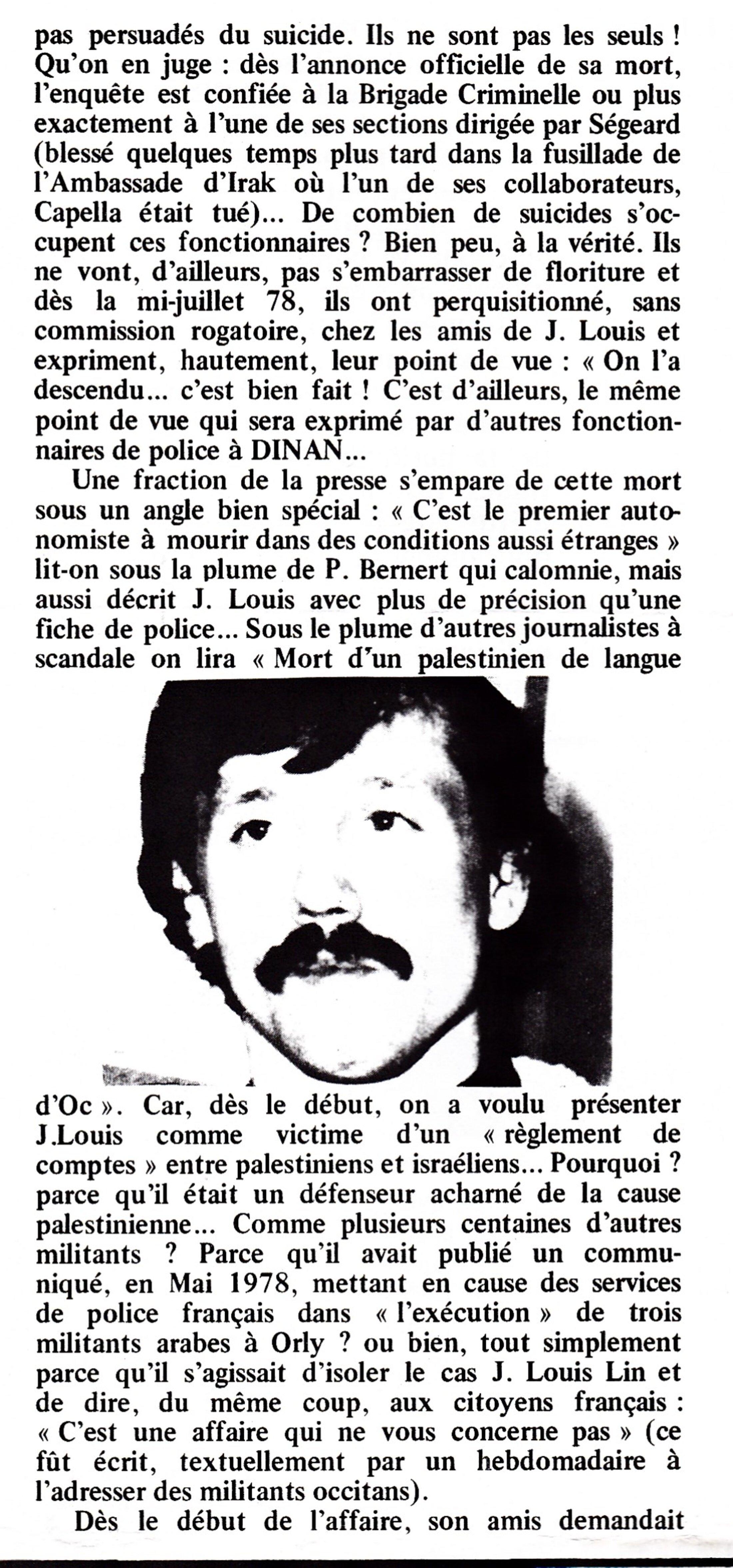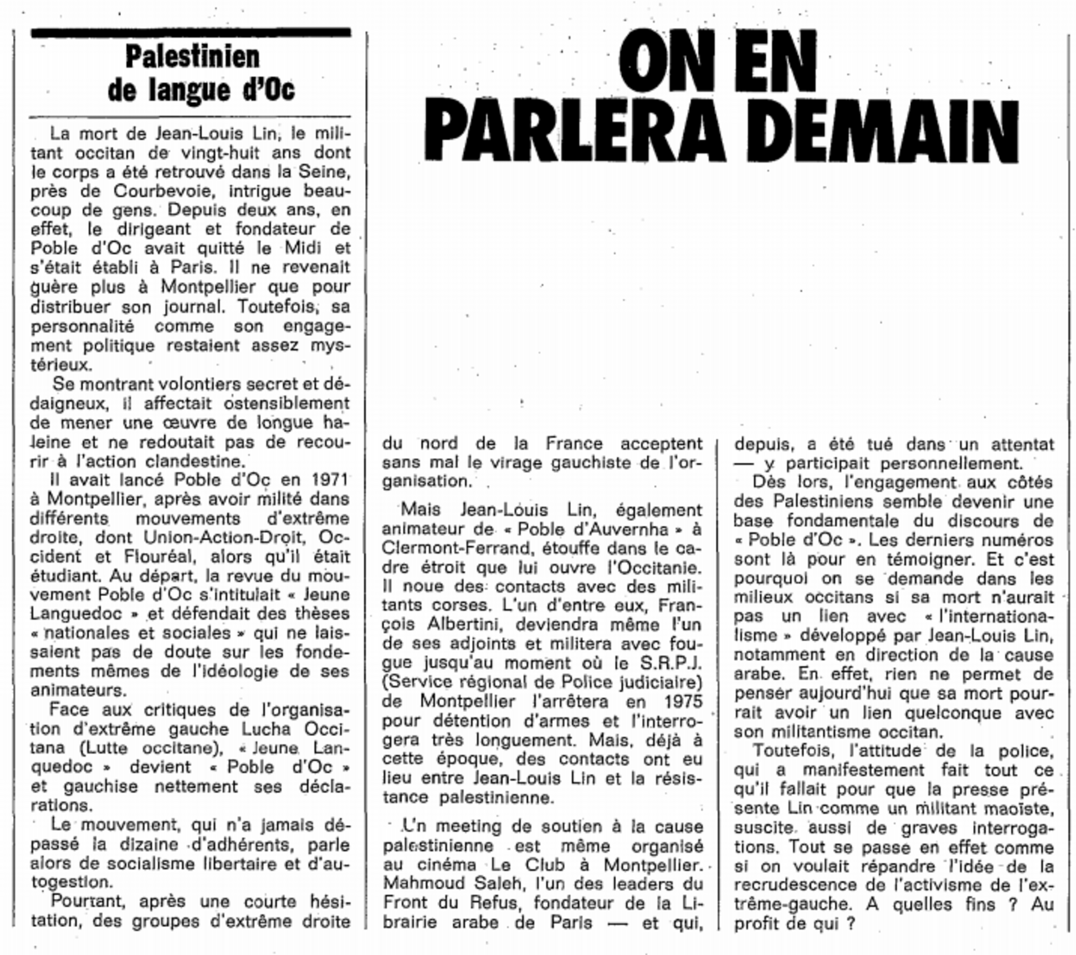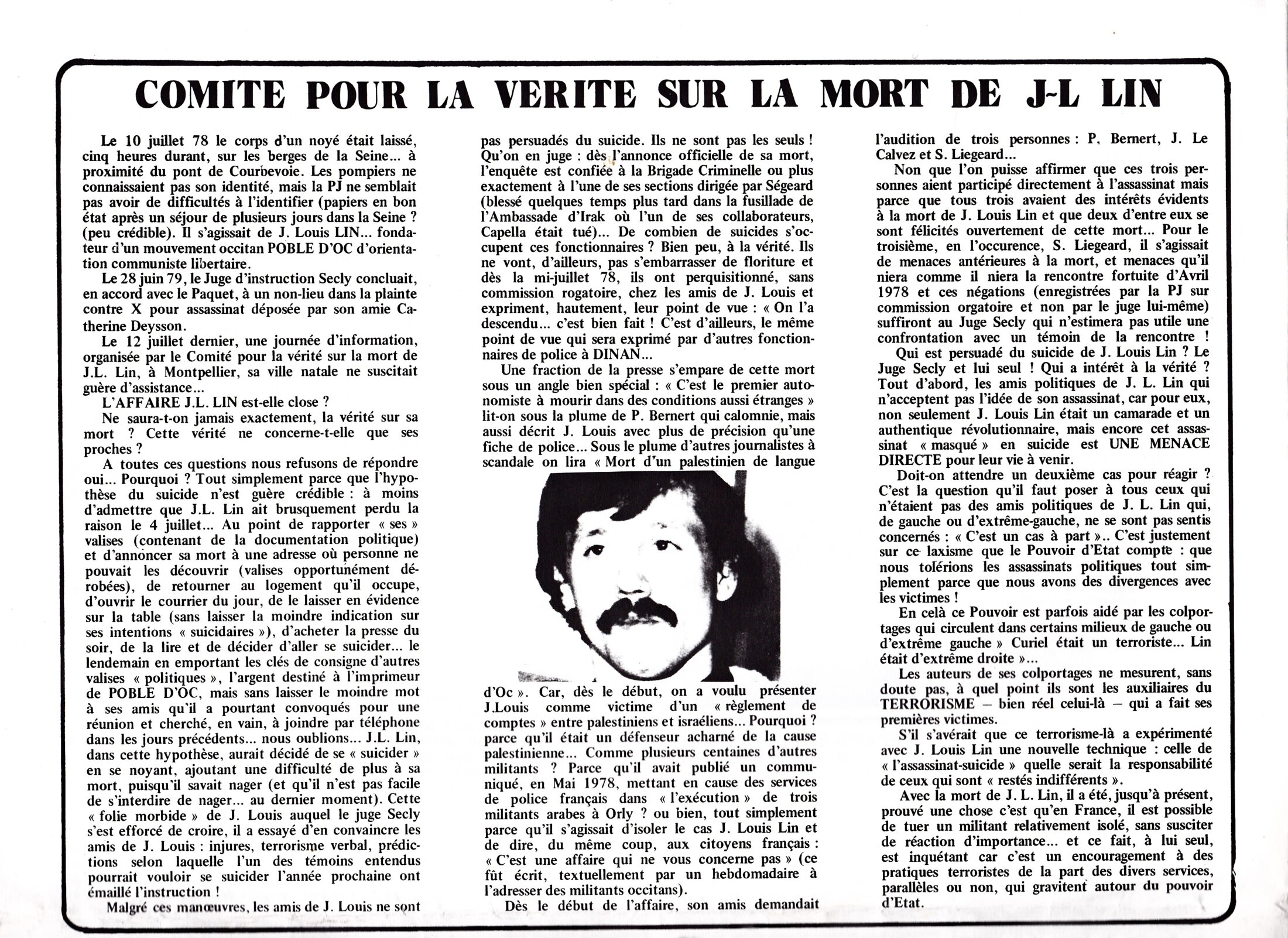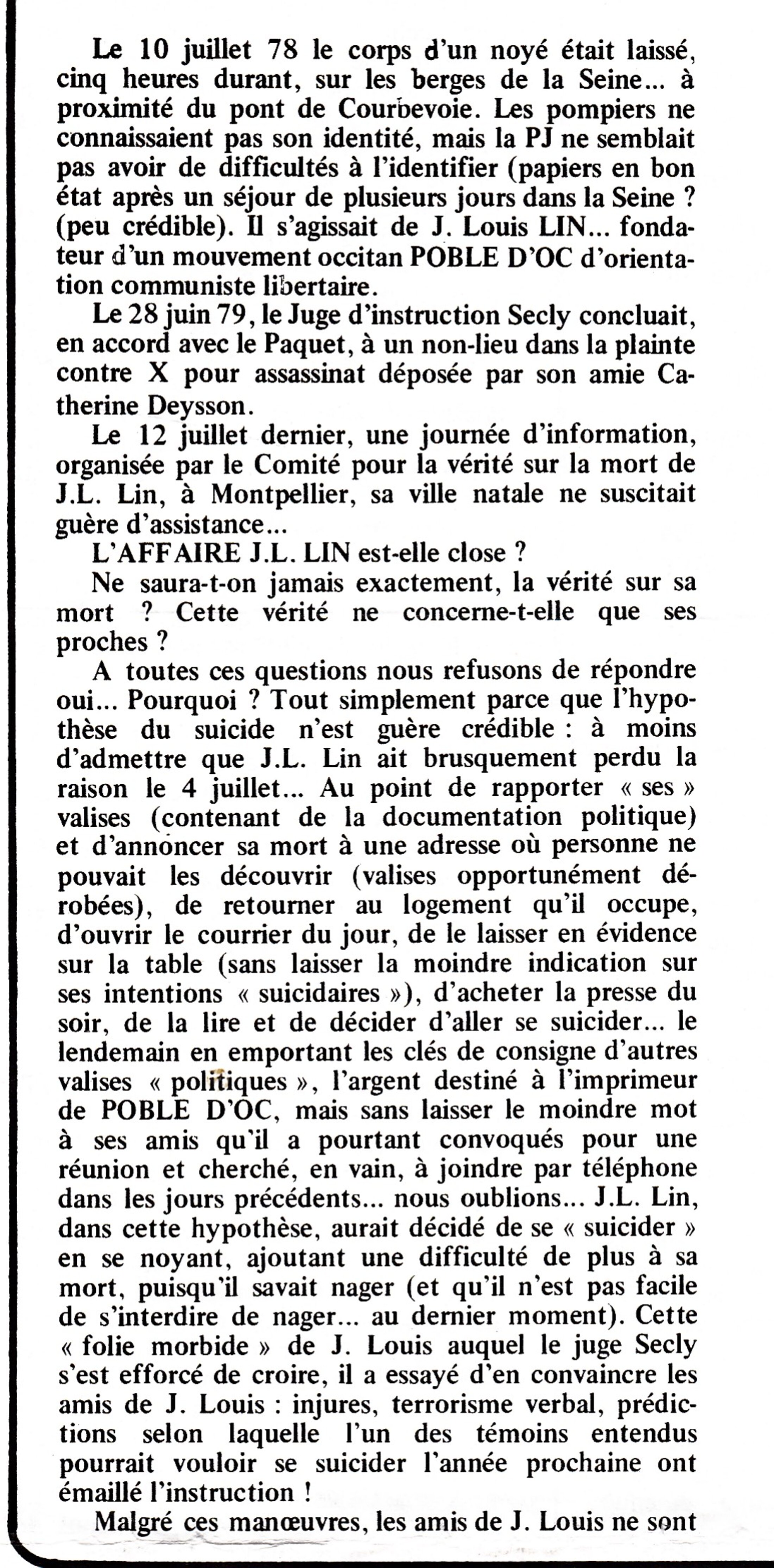 Sur cette sombre affaire, jamais élucidée, contemporaine des assassinats d'Henri Curiel et de Pierre Goldman, voici un article paru dans le numéro 35 (octobre 1979) de Poble d'Oc, une revue "révolutionnaire occitane" à la diffusion confidentielle, que dirigeait la victime: