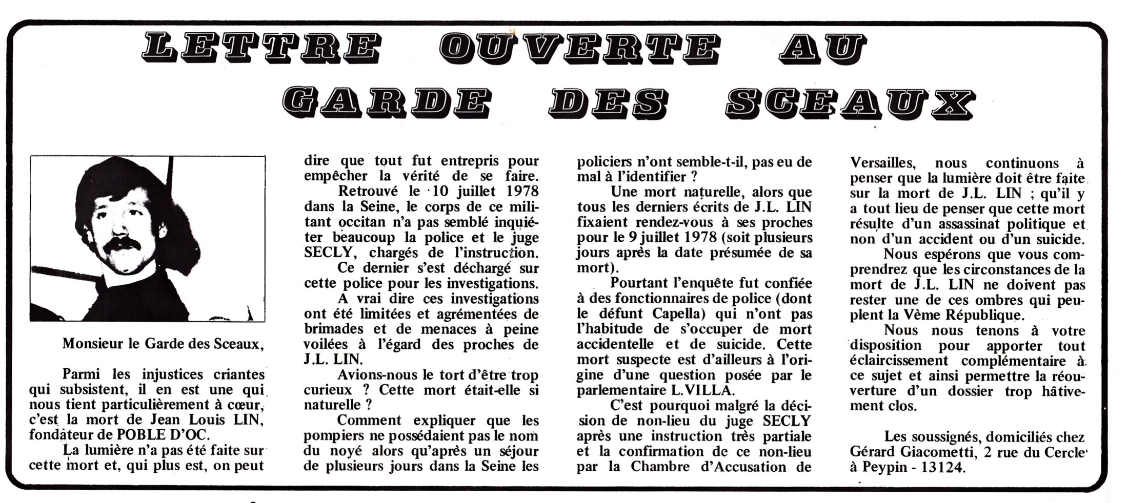 Enin, le numéro 41 de Poble d'Oc, imprimé à l'automne 1981, publiait cette lettre ouverte au garde des Sceaux, qui, bien évidemment, ne devait jamais recevoir de réponse: