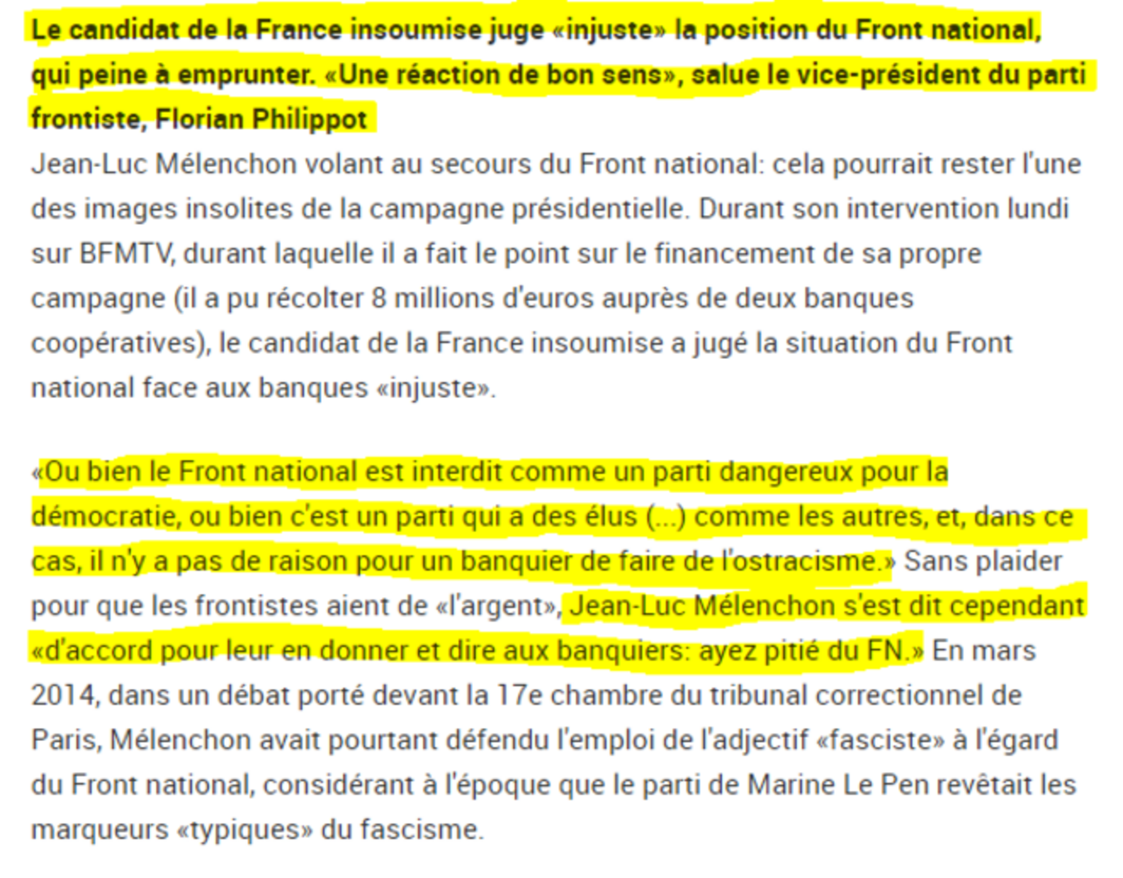 On se rappellera peut-être que, pendant la campagne électorale, le même Mélenchon avait déploré que les banques refusent de prêter au Front national: