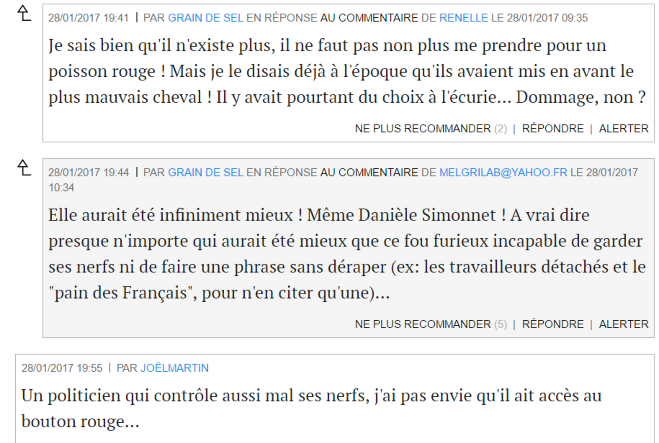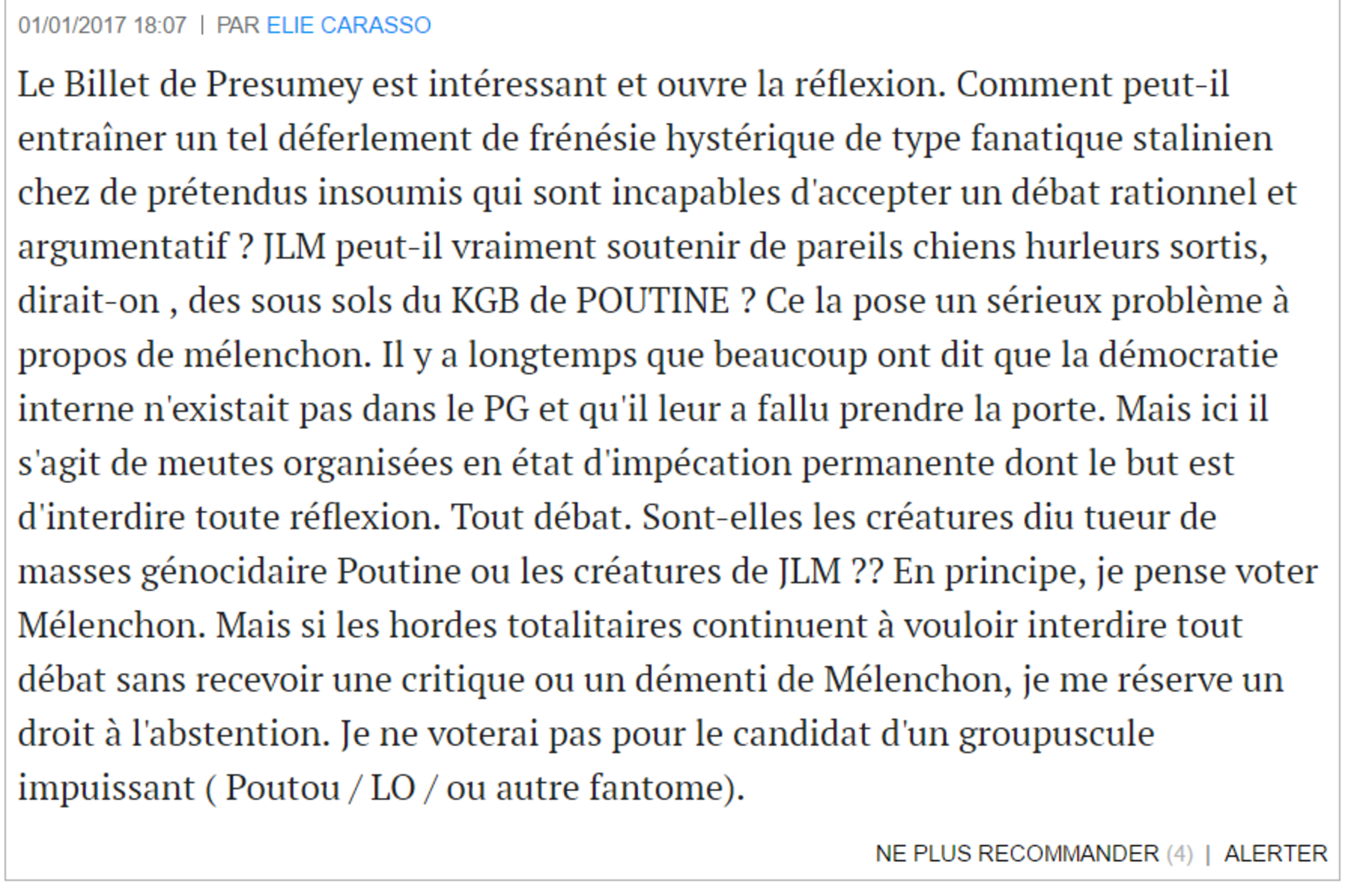 Pour ne rien dire d'un petit groupe de fanatiques, qui agonisent d'injures quiconque ose critiquer le Chef, et renvoient ainsi, de la France insoumise, une image encore plus hideuse. qui effraie encore plus, y compris parmi ceux qui s'apprêtaient à voter Mélenchon:
