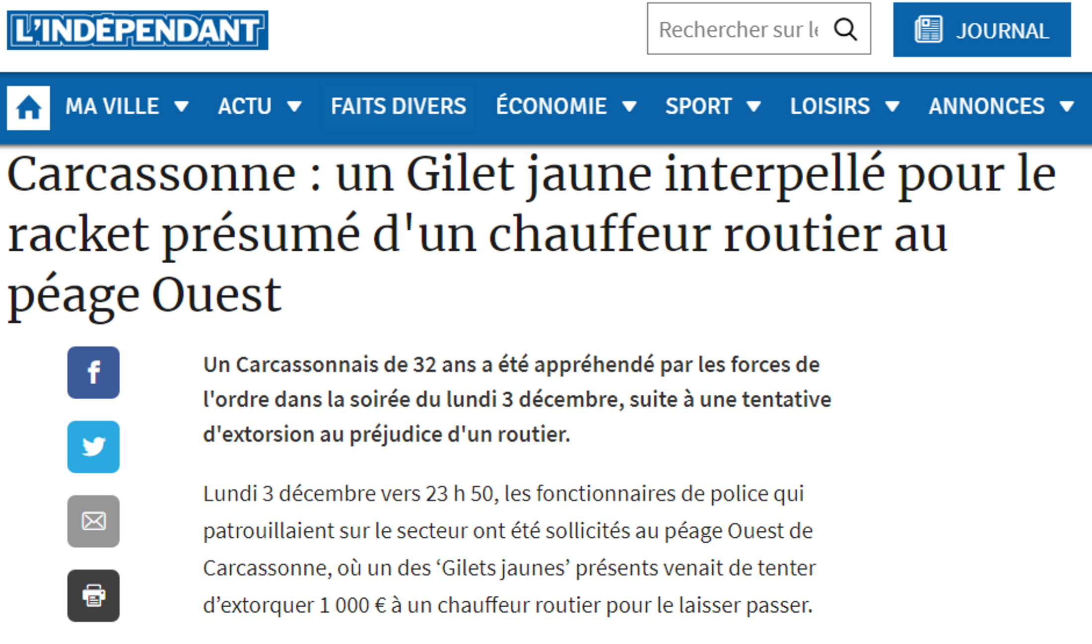 Il y a donc, parmi les Jaunes, non seulement des antisémites, des royalistes, des négationnistes, des conspirationnistes, des délateurs, des homophobes ( tout cela est documenté dans mes billets précédents) , mais aussi, tout simplement, des gangsters.