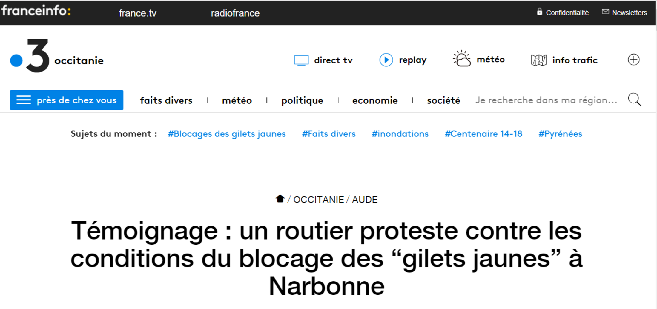 Lundi soir, la goutte d'eau qui a fait déborder sa colère, c'est que le seul camion qui a pu quitter le blocage, c'est celui du ramassage des ordures pour la ville de Narbonne. Et la nuit venue, des individus, probablement alcoolisés selon lui, ont secoué son camion parce que "c’est rigolo de faire chier les routiers".