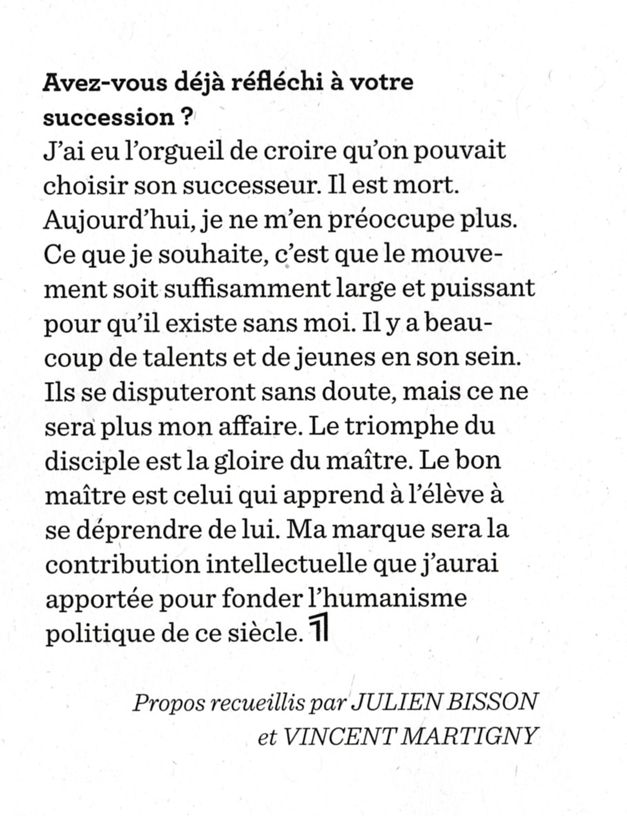 "Le triomphe du disciple est la gloire du maître. Le bon maître est celui qui apprend à l'élève à se déprendre de lui. Ma marque sera la contribution intellectuelle que j'aurais apportée pour fonder l'humanisme politique de ce siècle".