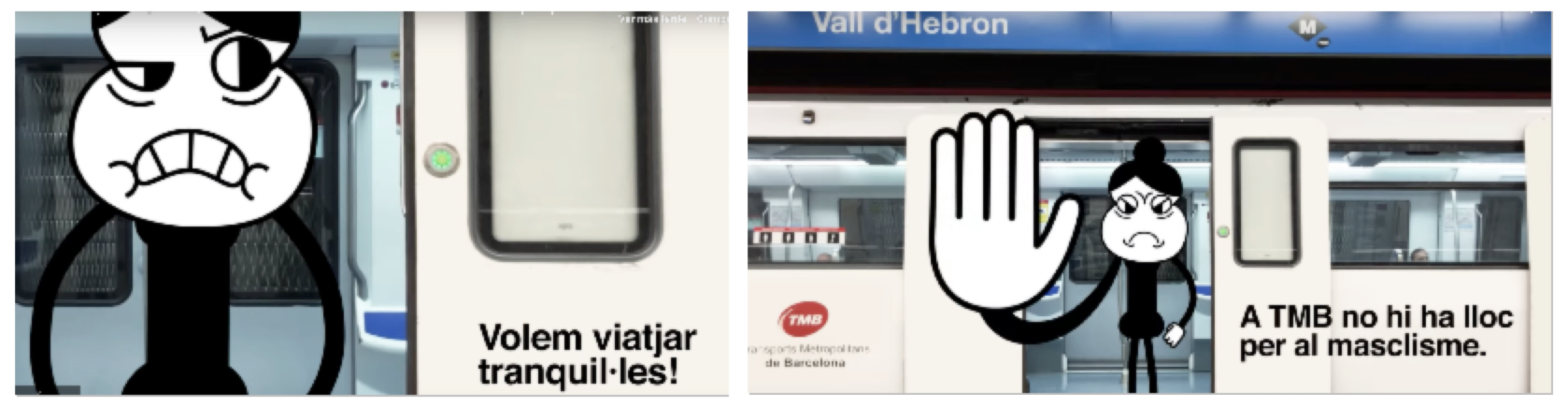 Passons la frontière espagnole et allons voir la campagne lancée par Transport metropolità de Barcelona (TMB) en 2019. Cette dernière représente Karma, figure d’une femme âgée coiffée d’un chignon utilisée dans différentes campagnes menées depuis 2017 contre les incivilités dans les transports. Ici, Karma incarne la parole des femmes et s’exclame, au nom des personnes usagères des transports en commun, victimes de harcèlement ou d’agressions : « Nous voulons voyager tranquilles ! ». La scène est suivie du message « À TMB il n’y a pas de place pour le machisme », nommant ainsi les éléments structurels qui font que ce type de comportements persistent, à savoir le machisme entendu comme l’ensemble des attitudes, pratiques sociales et croyances basées sur la supériorité des hommes sur les femmes.
