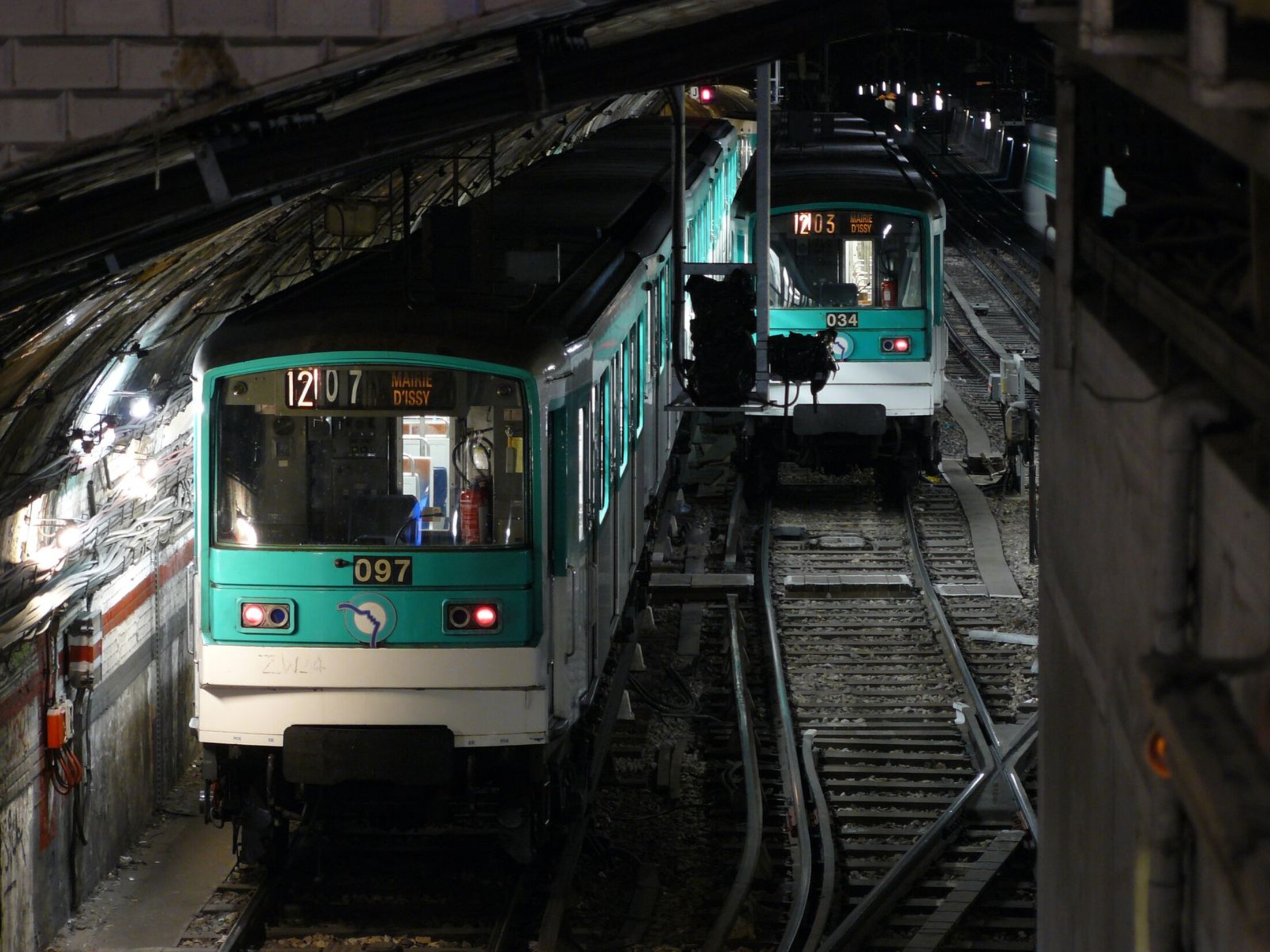 Photographie: Garages de Porte de Versailles, ligne 12, rames 12097 et 12034 de Formation 3. Le MF 67, metro-de-paris.over-blog.com.