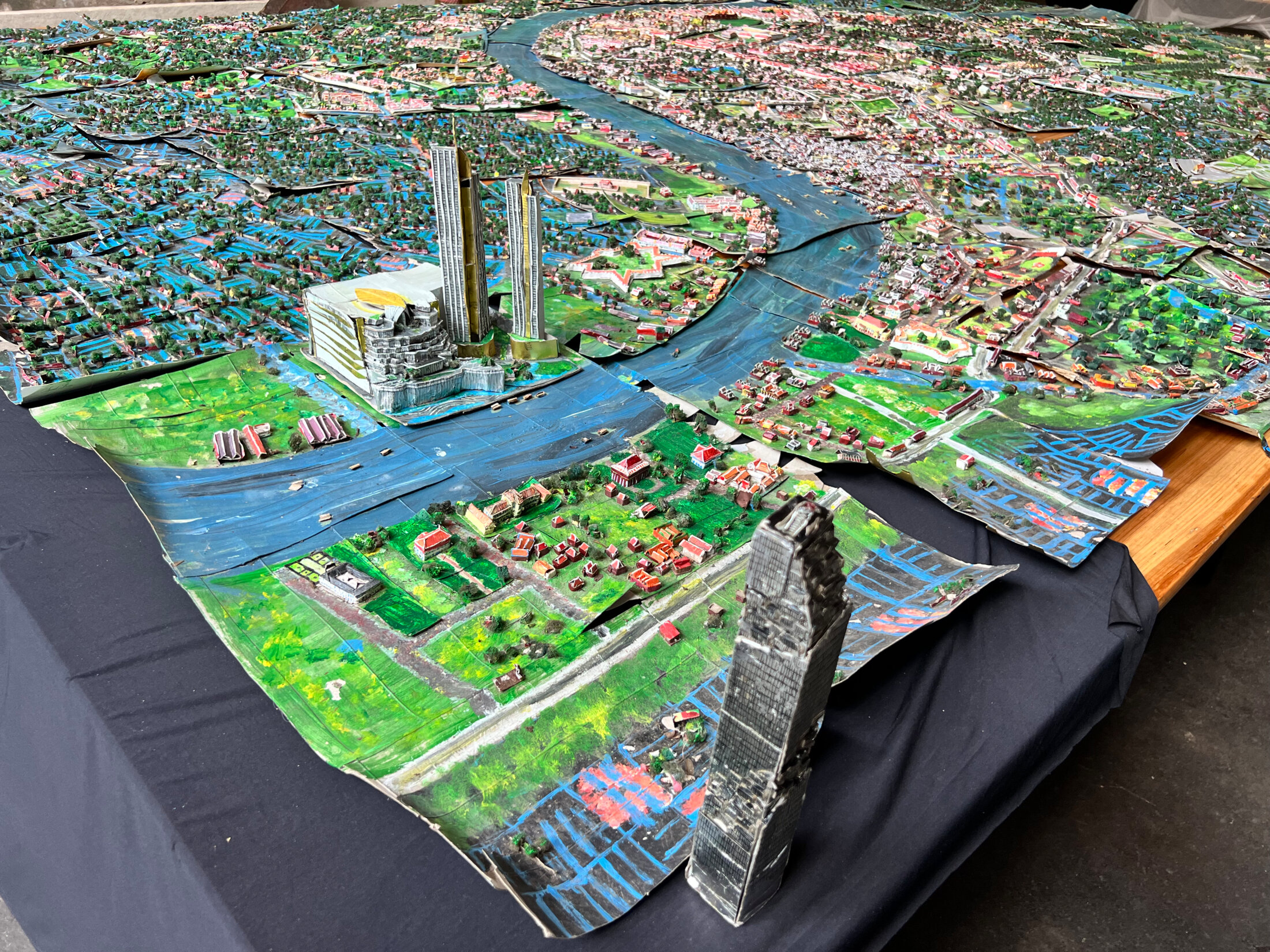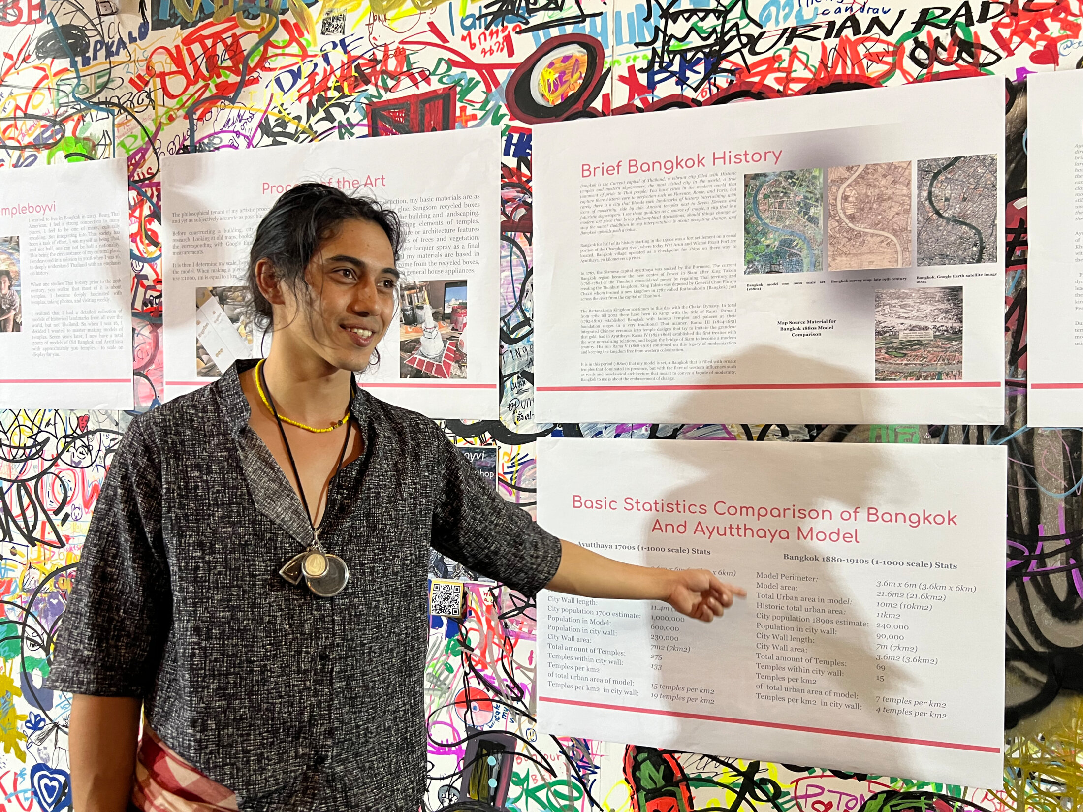 Dans un coin de la maquette, il a érigé en contraste quelques gratte-ciels contemporains autour du centre commercial de luxe IconSiam, pour montrer les hauteurs vertigineuses qui caractérisent maintenant la Cité des Anges. Ils servent aussi de repères visuels, révélant à quel point l'ancienne Bangkok était compacte avant que la croissance du XXe siècle engloutisse son horizon et les plaines rizicoles des provinces adjacentes.