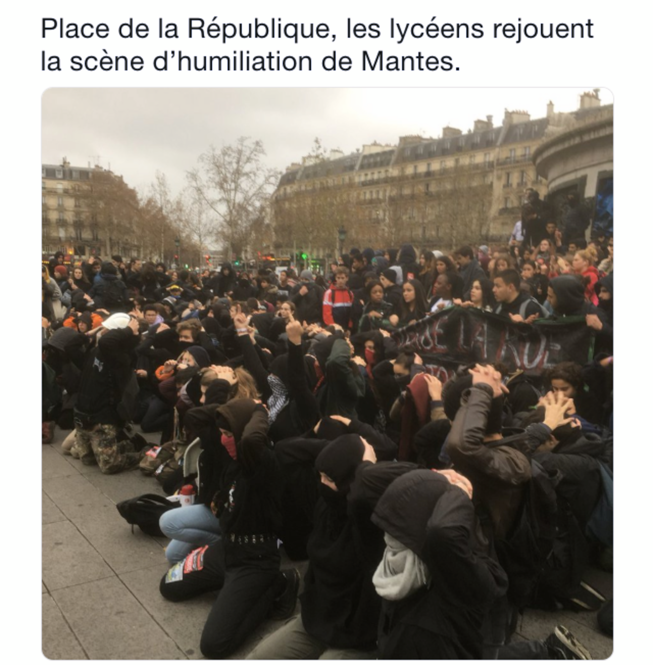 Les images de l’arrestation de 150 jeunes à Mantes resteront. Elles sont indélébiles. C’est ce qu’ont souhaité ceux qui les ont sciemment filmées et diffusées. Grand bien leur en fasse ; ces images les salissent à jamais tout comme elles salissent ceux qui les ont soutenues et justifiées. Mais, plus grave, les faits eux resteront marqués dans la tête de ces enfants à genoux, mains sur la tête, humiliés comme jamais. Les faits laisseront des traces dont nous ne mesurons pas l’ampleur et les effets. En attendant Les lycéennes et lycéens en manifestation ont préféré détourner le symbole pour le renvoyer à la laideur des visages haineux de la République. On l’a dit souvent, la jeunesse est belle. Hier, ils ont crié leur fierté en reprenant la libre possession de leurs gestes : à genoux, mais debout, leur dignité jetée à la face de leurs bourreaux.