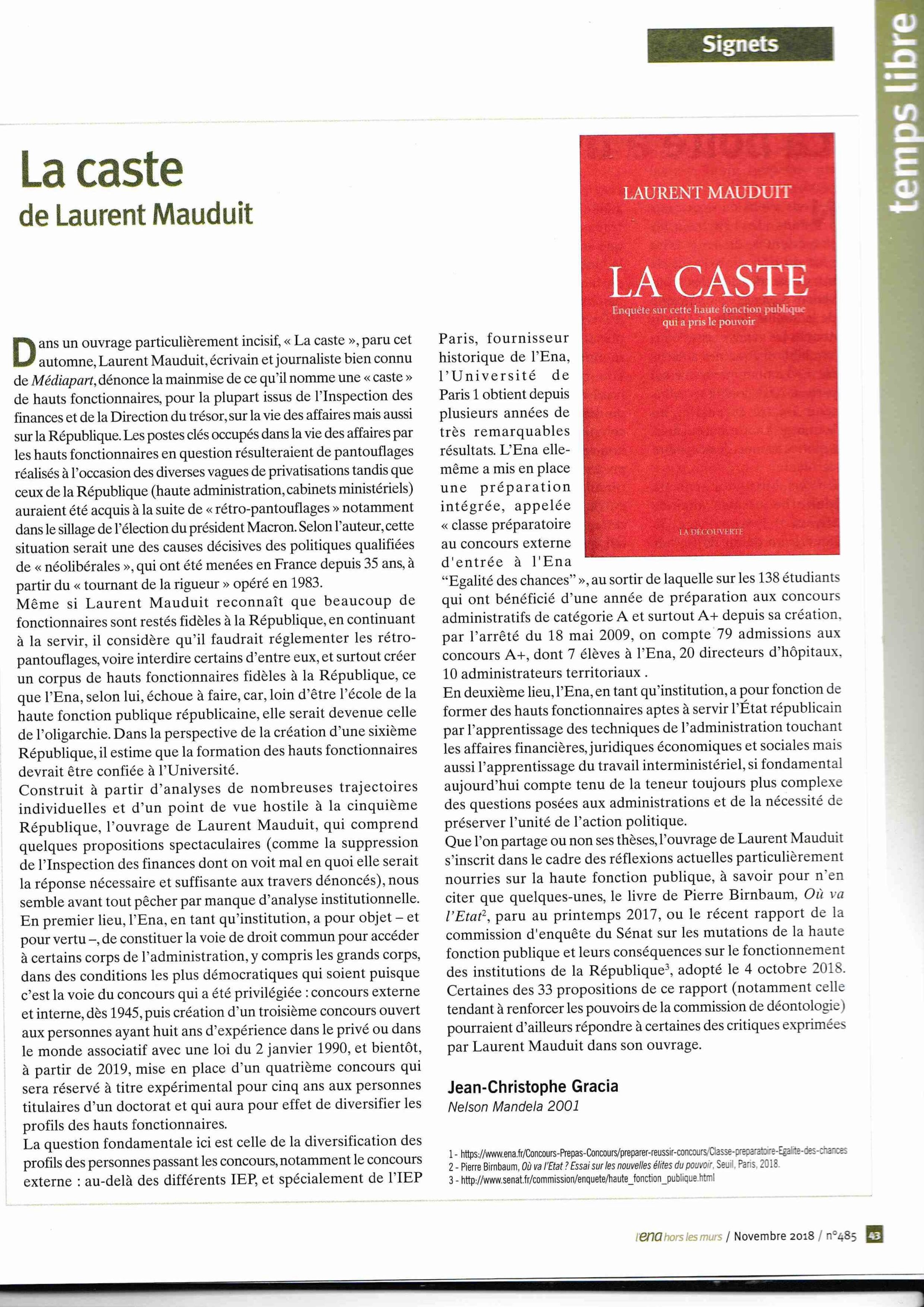 La revue « L’ENA hors les murs », publiée par l’association des anciens élèves de l’École nationale d’administration (ENA) publie dans sa dernière livraison (n°485, novembre 2018) une analyse sur une page de mon essai sur La caste (Editions La découverte).