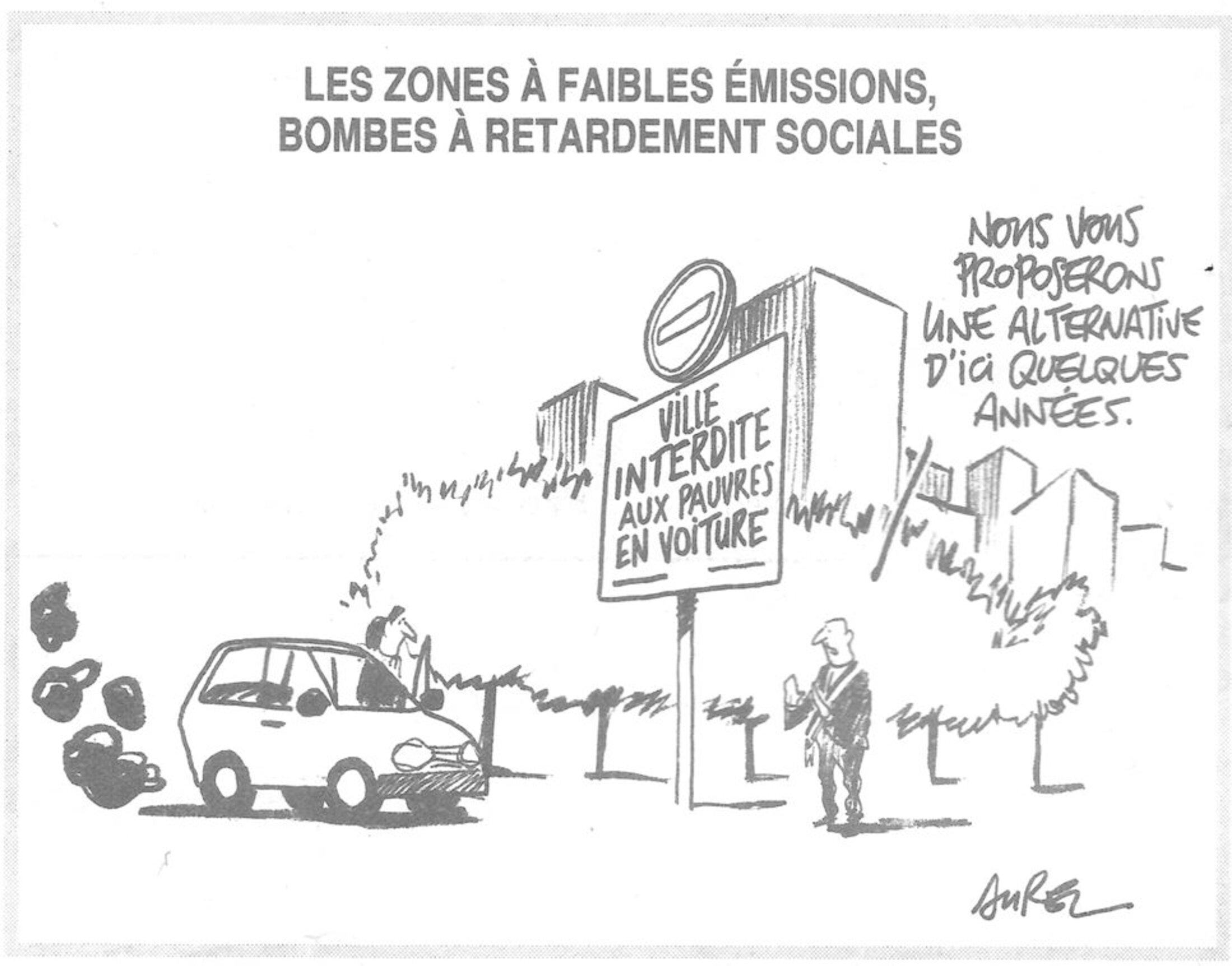 Sous couvert de santé publique et de protection de l’environnement, les zones à faibles émissions (ZFE) sont défendues par les « bobos », ceux que chantait Renaud¹, et imposées à « la France périphérique » (pour reprendre le titre du livre du géographe Christophe Guilluy), première victime de la verbalisation automatique annoncée par le ministre délégué aux Transports, Christophe Béchu². Ces ZFE entérinent, en réalité, l’exclusion socio-spatiale des classes laborieuses (ouvriers qualifiés, employés administratifs, chauffeurs routiers, techniciens…) reléguées loin des métropoles par la gentrification (embourgeoisement des centres-villes) et désormais stigmatisées (nombreux déplacements en automobile, obligation de posséder deux voitures, rarement récentes). Finalement, les ZFE sont les nouvelles zones de fracture et d’éviction, moteurs de toutes les radicalités sociales et politiques.³