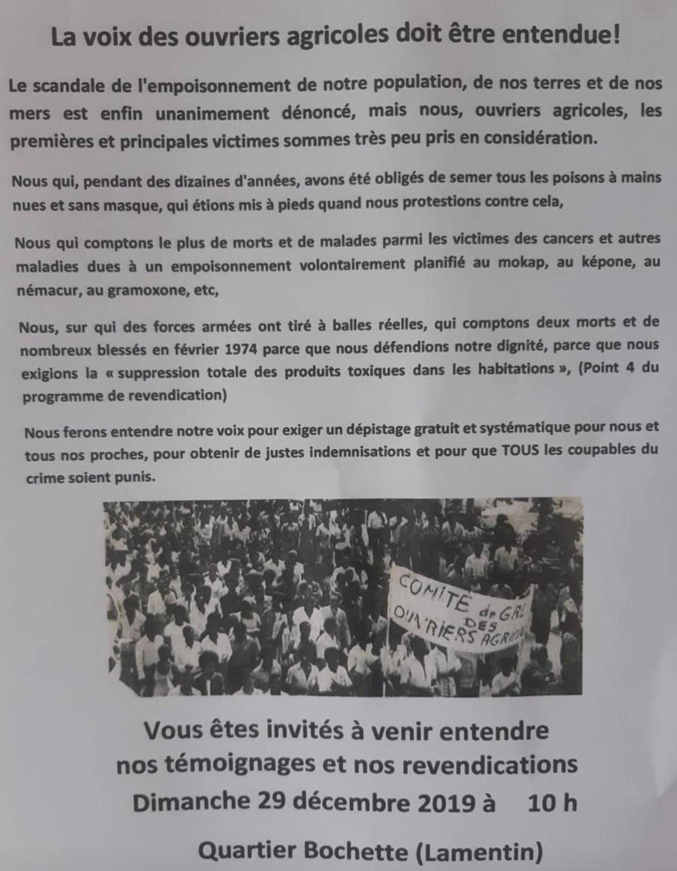 Enfin, il faut signaler les conditions déplorables de travail des ouvriers agricoles. Alors que les planteurs sont d’ores et déjà au courant de la dangerosité du produit, les témoignages des employés de l’époque font état de pas ou peu de protection pendant les épandages; et plus grave encore, de chantage à l’emploi en cas de plaintes.6