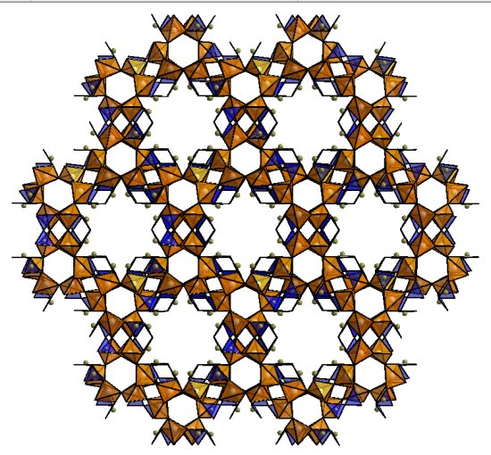 Pyramides à base carrée VO5 et triangles BO3 connectés par sommets. Phase cubique vue en projection selon la direction [111].