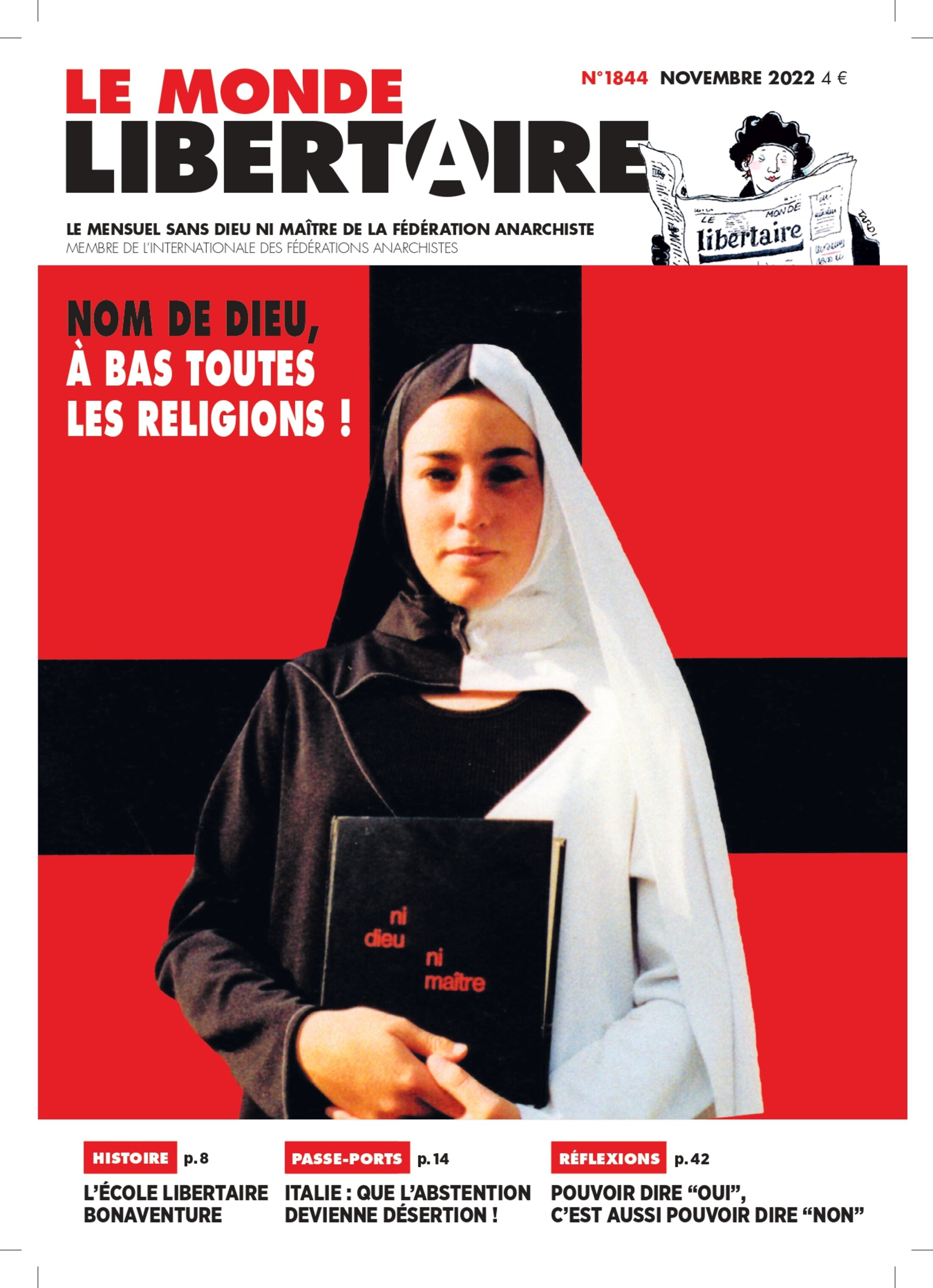 La rédaction d’un édito est un exercice particulier. Je devrais décliner le thème de « À bas toutes les religions » pour te donner l’envie de poursuivre la lecture. Mais il se trouve que sur cette même page nous publions un texte d’un anarchiste charentais (note l’anagramme) qui conviendrait parfaitement en guise de. Alors, pour ne pas tomber dans la redondance, je me contenterai de signaler la grande place faite dans ce Monde libertaire à la situation en Iran.