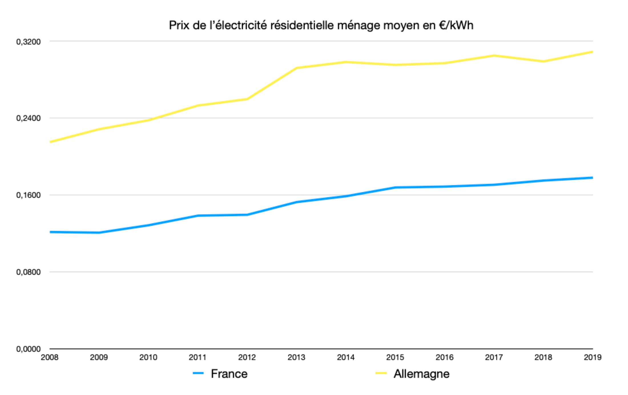 Nous entendons souvent que les énergies renouvelables sont moins chères que les autres moyens de production, et en particulier du nucléaire. Ce qui est totalement faux car il faut d’abord associer le système de stockage pour les énergies non pilotables, afin de pouvoir les comparer aux autres sources disponibles à la demande comme le nucléaire, l’hydroélectricité, ou encore les fossiles, et là le bât blesse, elles ne sont plus du tout compétitives. Les ménages Français et Allemands ont vu le prix de leur électricité augmenter fortement entre 2008 et 2019 (+44%). En France cela est dû en grande partie à la libéralisation du marché de l’électricité qui a poussé la commission de régulation de l’énergie à augmenter petit à petit le tarif réglementé de vente afin que les fournisseurs alternatifs puissent devenir compétitifs. C’est absurde mais c’est même écrit dans les textes officiels : « cette méthodologie de calcul vise à garantir la contestabilité de ces tarifs par les fournisseurs alternatifs, c’est-à-dire la faculté pour les fournisseurs alternatifs de proposer aux consommateurs des offres de marché à prix égaux ou inférieurs aux TRV. » En 2019 le prix de l’électricité était toujours bien supérieur en Allemagne comparativement à la France (+74%).