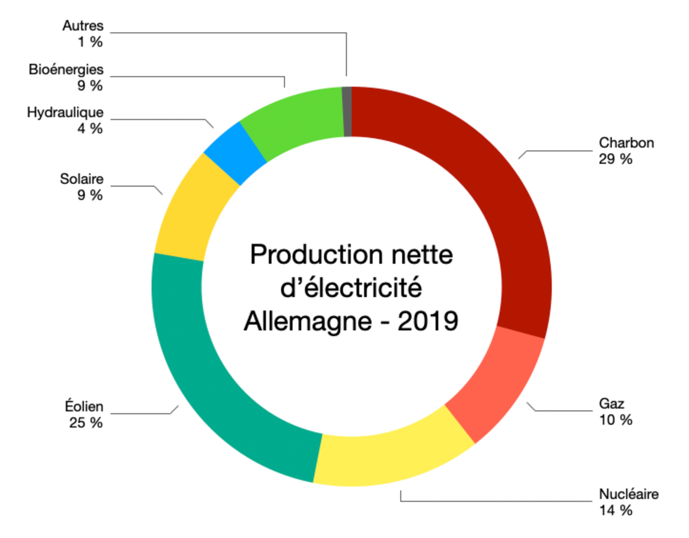 L’Allemagne au contraire sollicite depuis des années le charbon, le lignite et le gaz en production de base et ne dispose pas d’un grand parc électronucléaire et compte en sortir avant 2025. L’Allemagne a fait le choix de prioriser la sortie du nucléaire à la sortie du charbon et du lignite, ce qui explique que pour l’heure que le mix énergétique allemand comporte toujours une grande part d’énergies fossiles dont le pays a du mal à se passer. Vient ensuite l’éolien suivi du nucléaire.