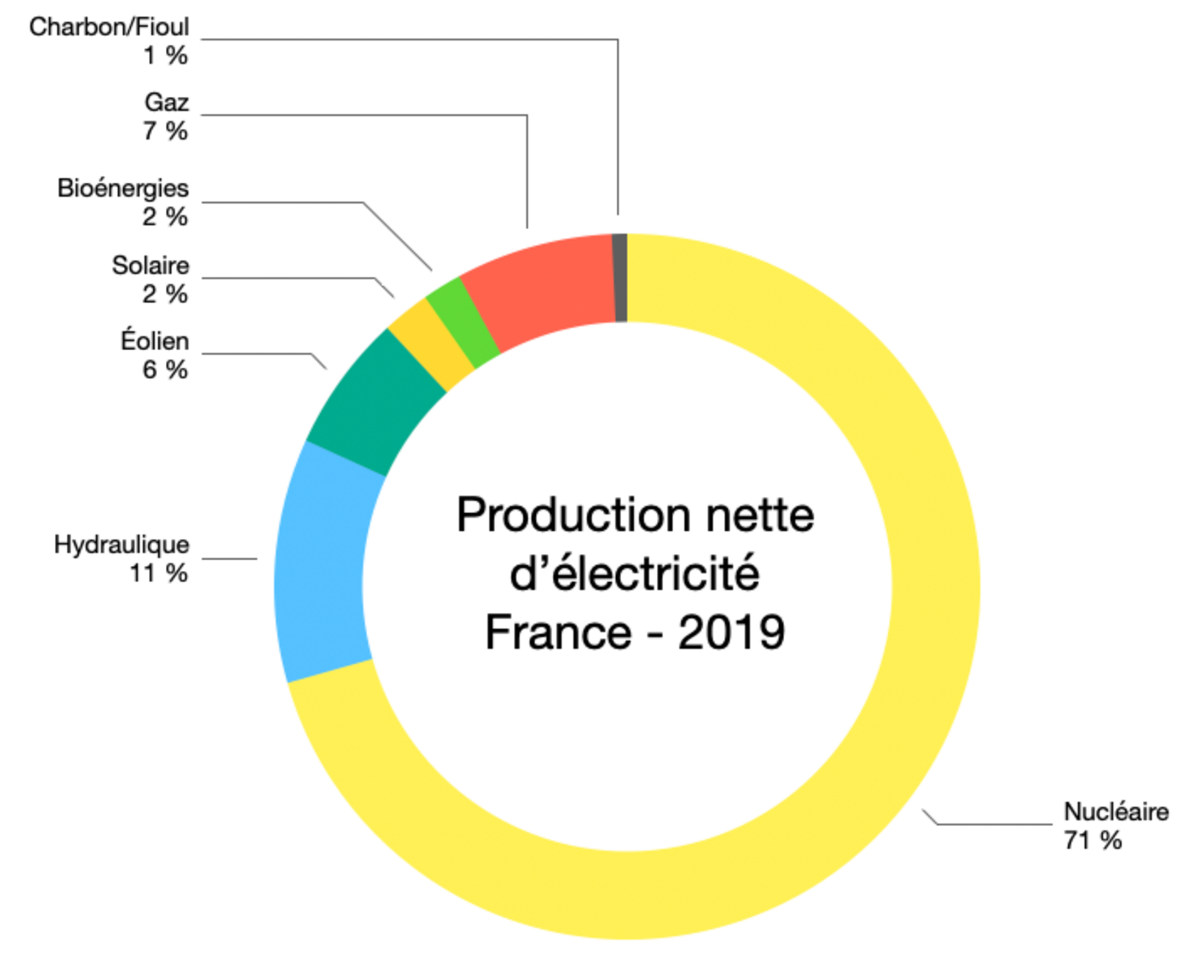 En France, c’est le nucléaire qui occupe la première place du podium en production électrique. Il est n°1 ex-æquo des moyens de production qui émettent le moins de CO2 avec les barrages hydrauliques qui occupent la 2ème place de la production française. Le choix a été fait lors de la programmation pluriannuelle de l’énergie de porter la part du renouvelable à 50% et de baisser celle du nucléaire à 50% à horizon 2035. Le but est de sortir par la même occasion complètement des restes du gaz et du peu de charbon et de fioul que nous utilisons actuellement. Selon le gouvernement, il est nécessaire pour la France de continuer de produire une électricité bas carbone mais aussi de diversifier son mix électrique. Alors même que la baisse du nucléaire risque au contraire d’augmenter l’intensité carbone de notre électricité, en effet contrairement à une idée reçue les renouvelables électriques produisent plus de CO2 que le nucléaire. Il faut bien se le dire : il n’y a pas d’énergie propre.