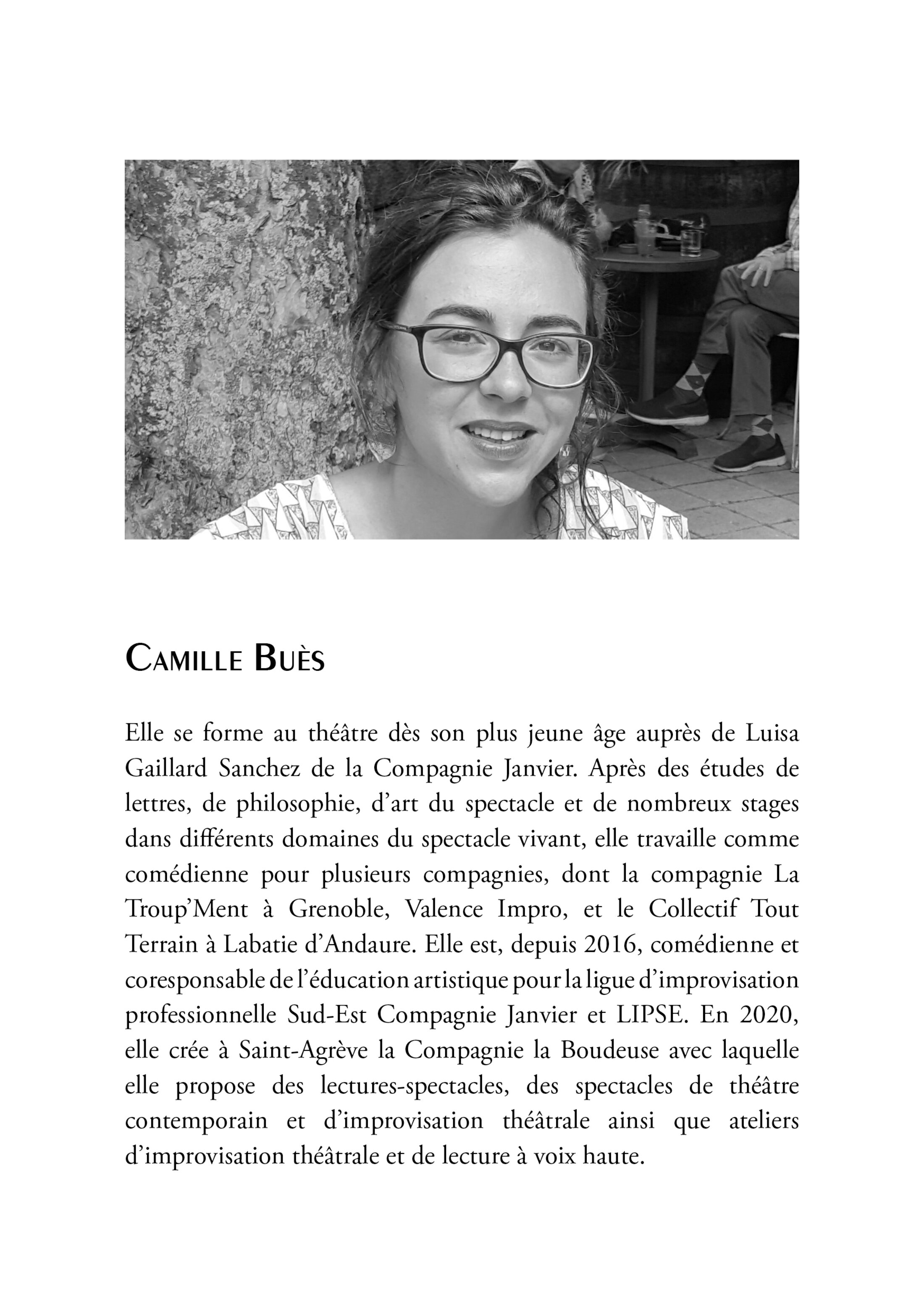 Cette année, les Lectures sous l'arbre vous proposent un atelier d'improvisations poétiques, animé par la comédienne Camille Buès.