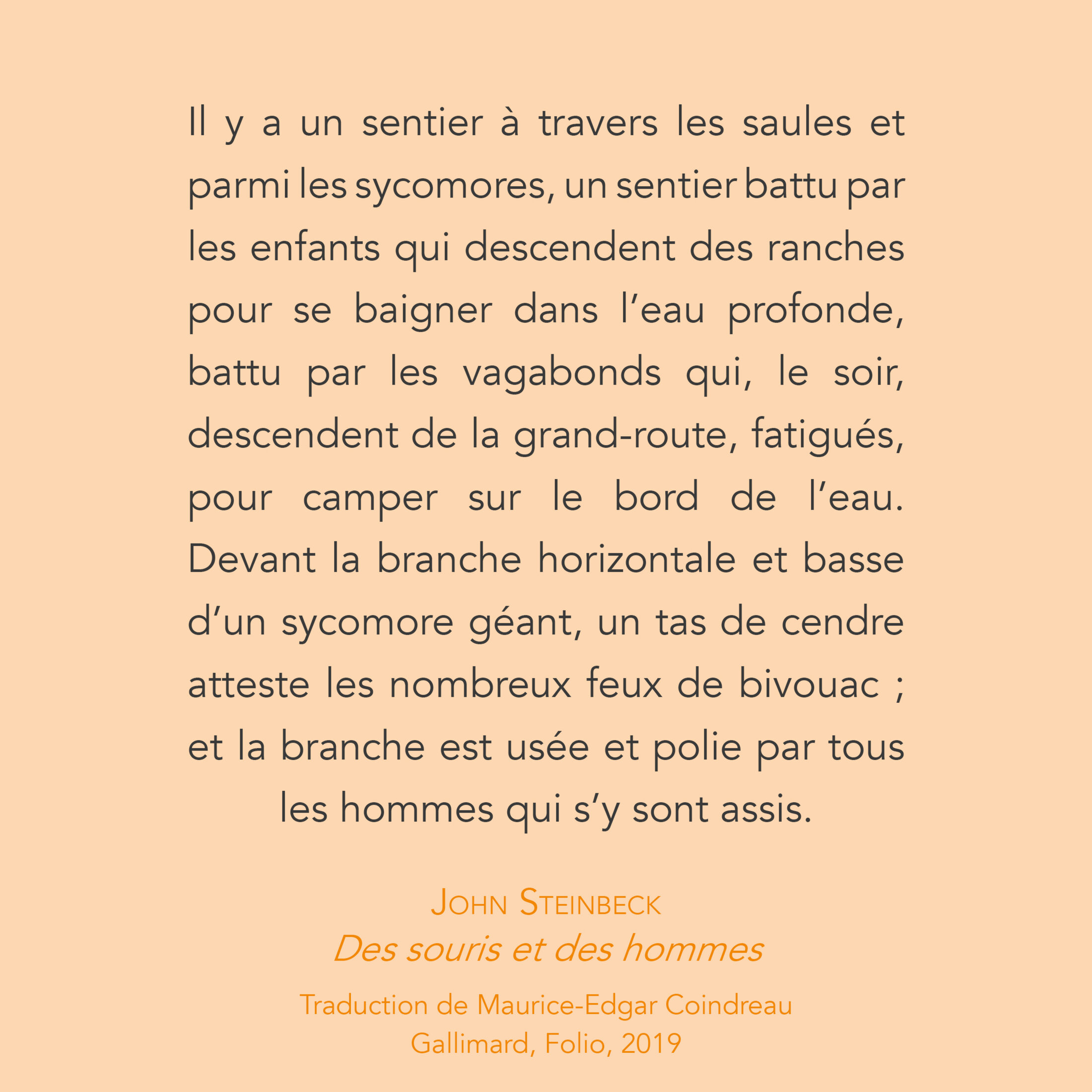 Le mercredi 17 août 2022, venez passer la soirée en compagnie du comédien Laurent Soffiati autour de John Steinbeck : – À 21h, à la Salle des arts de Saint-Agrève (07) : lecture par Laurent Soffiati de Des souris et des hommes (traduction de Maurice-Edgar Coindreau), texte majeur de l'auteur américain Prix Nobel de littérature en 1962, accompagnée en musique par le groupe Antik Jazz Quartet. – À 20h, à la bibliothèque de Saint-Agrève : en amont de la soirée, rencontre avec le comédien animée par la journaliste Martine Laval.
