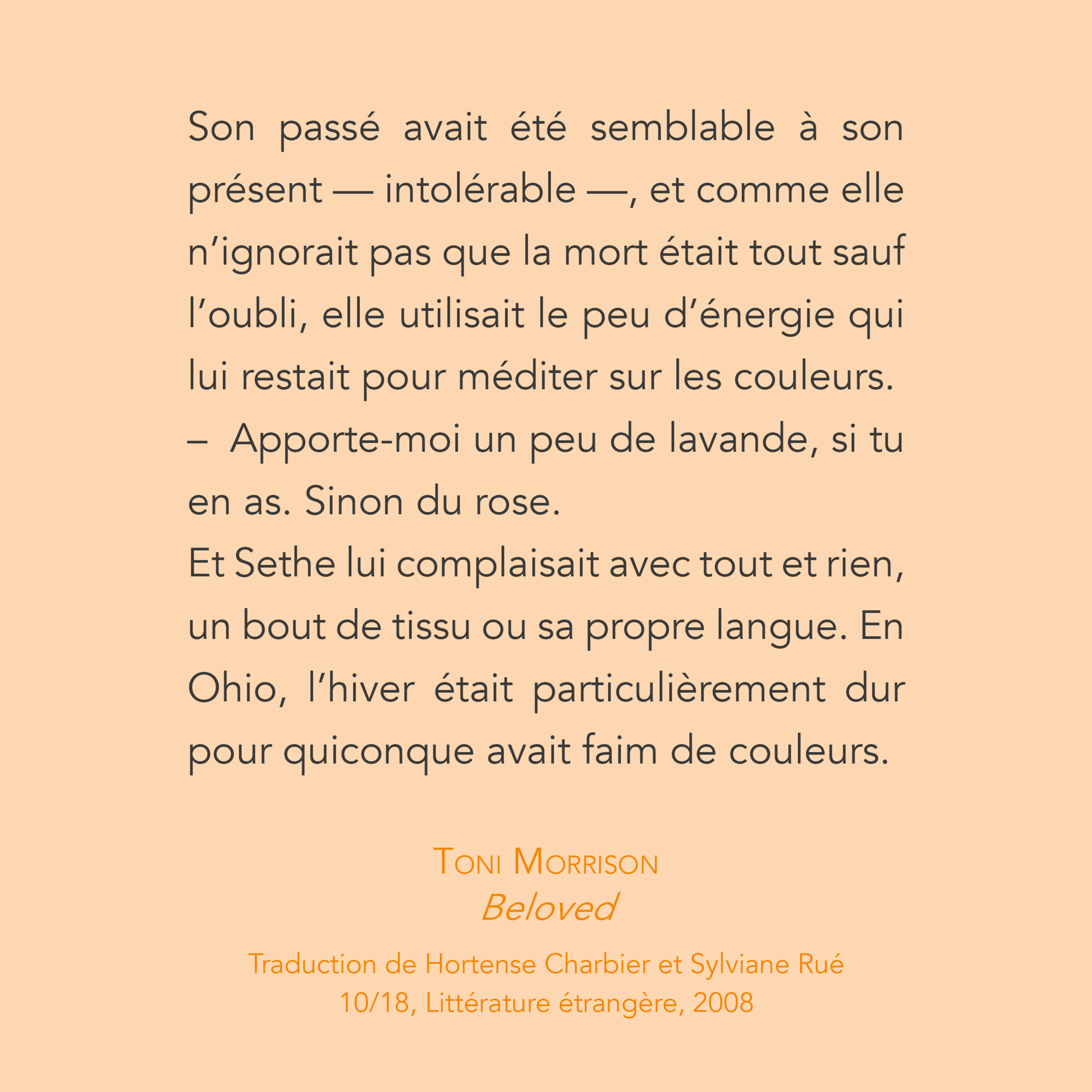 Jeudi 18 août à 14h30 : « Hommage à Toni Morrison ». Présentation par Jean D'Amérique, auteur, et lecture par Julie Moulier, comédienne, de « Beloved » (traduction de Hortense Charbier et Sylvaine Rué).