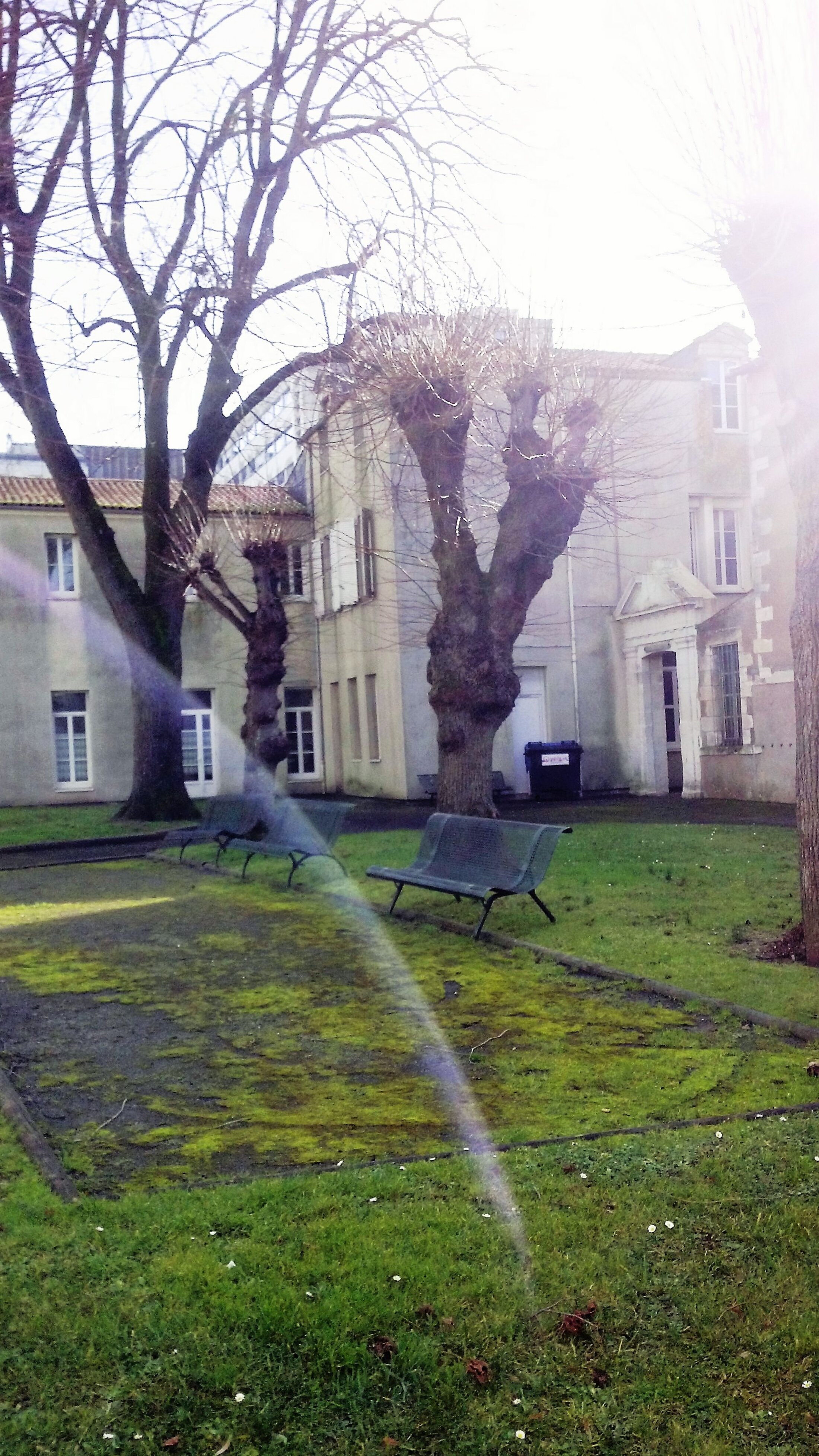 Visiter un agonisant ne permet pas de profiter pleinement d'une ville, l'architecture de la rochelle est pourtant intéressante, alors les photos prises à la volée permettent de creuser des détails historiques via des souvenirs non prégnants. La photo avec la pelouse est celle de la maison des familles, pour accueillir les proches d'un hospitalisé. 15€ par personne la nuit, studio avec douche