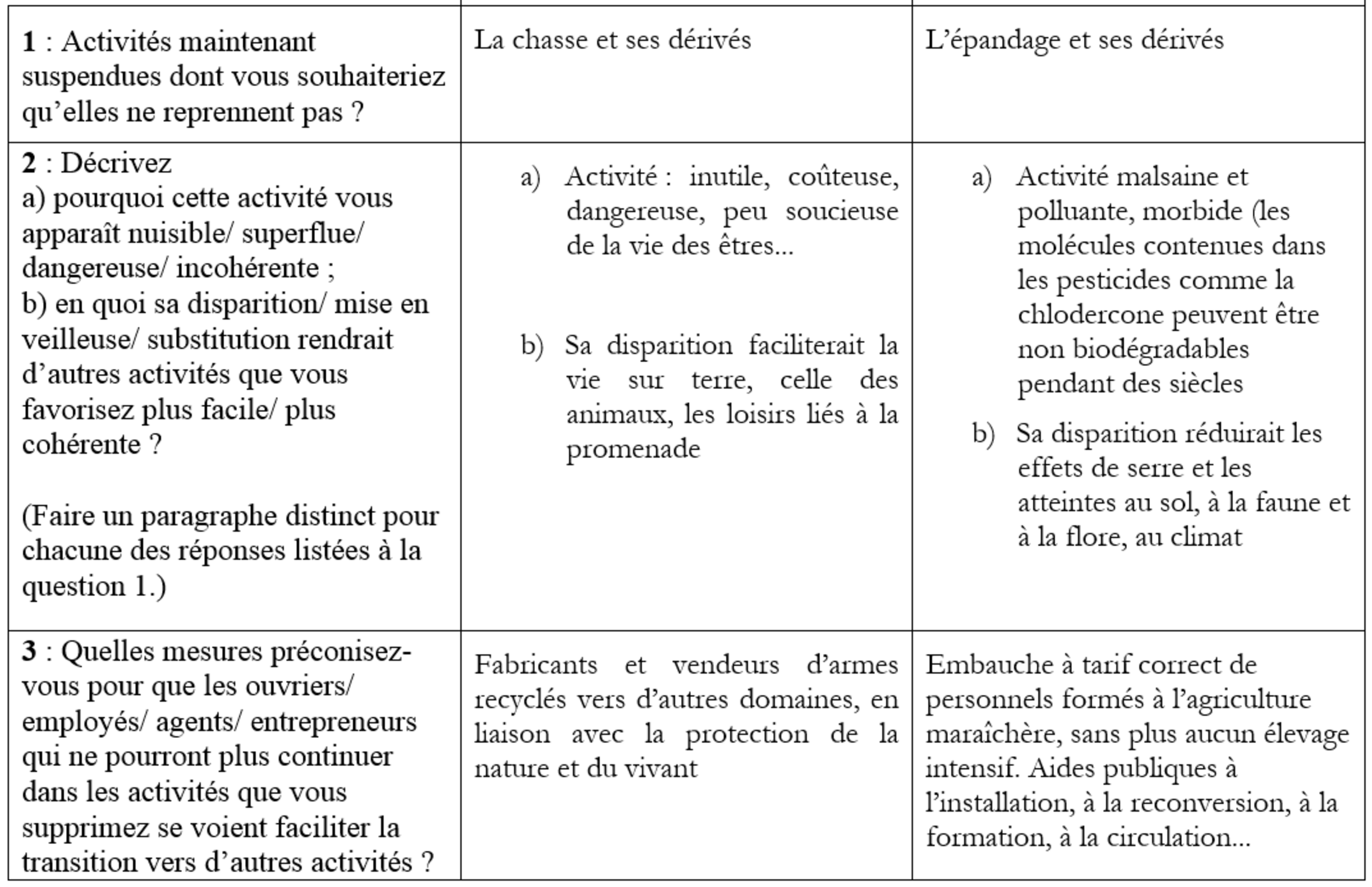 Il s’agit de faire la liste des activités dont vous vous sentez privés par la crise actuelle et qui vous donnent la sensation d’une atteinte à vos conditions essentielles de subsistance. Pour chaque activité, pouvez-vous indiquer si vous aimeriez que celles-ci reprennent à l’identique (comme avant), mieux, ou qu’elles ne reprennent pas du tout. Répondez aux questions suivantes :