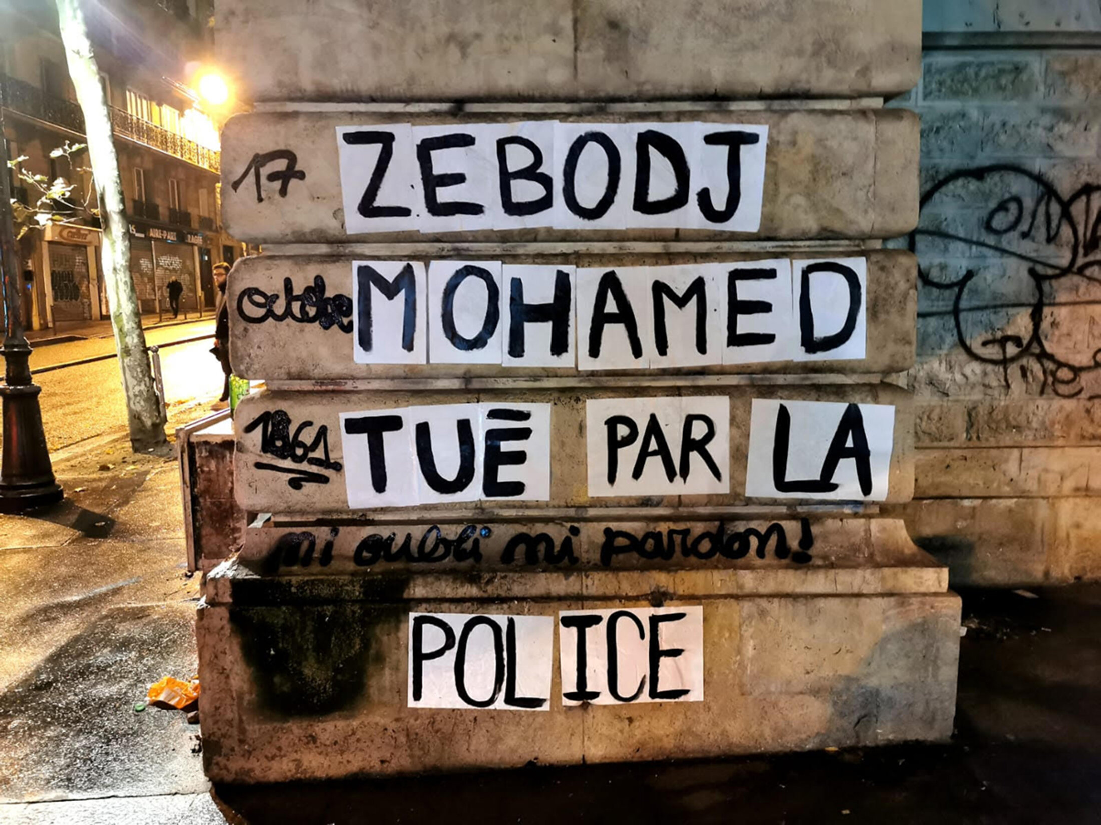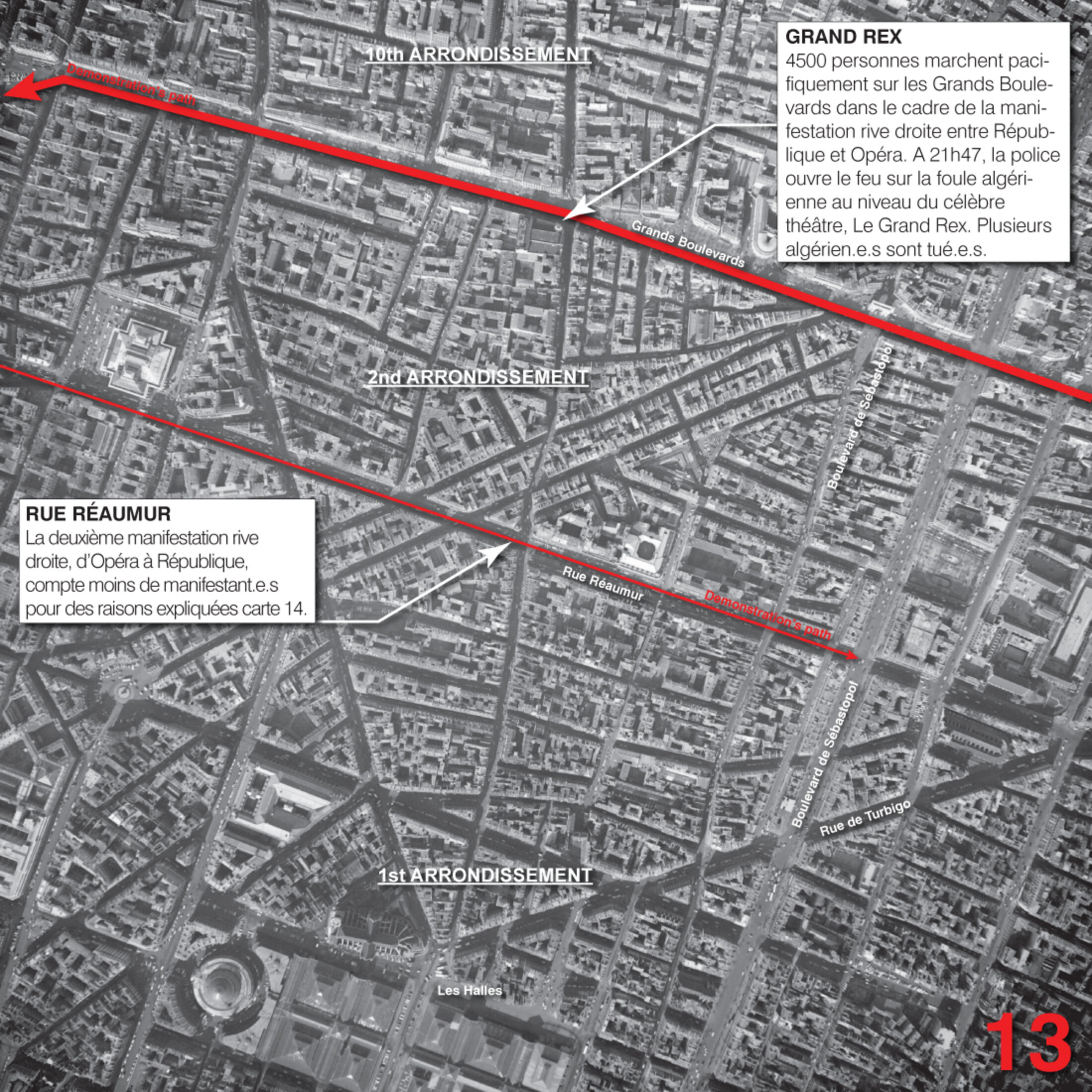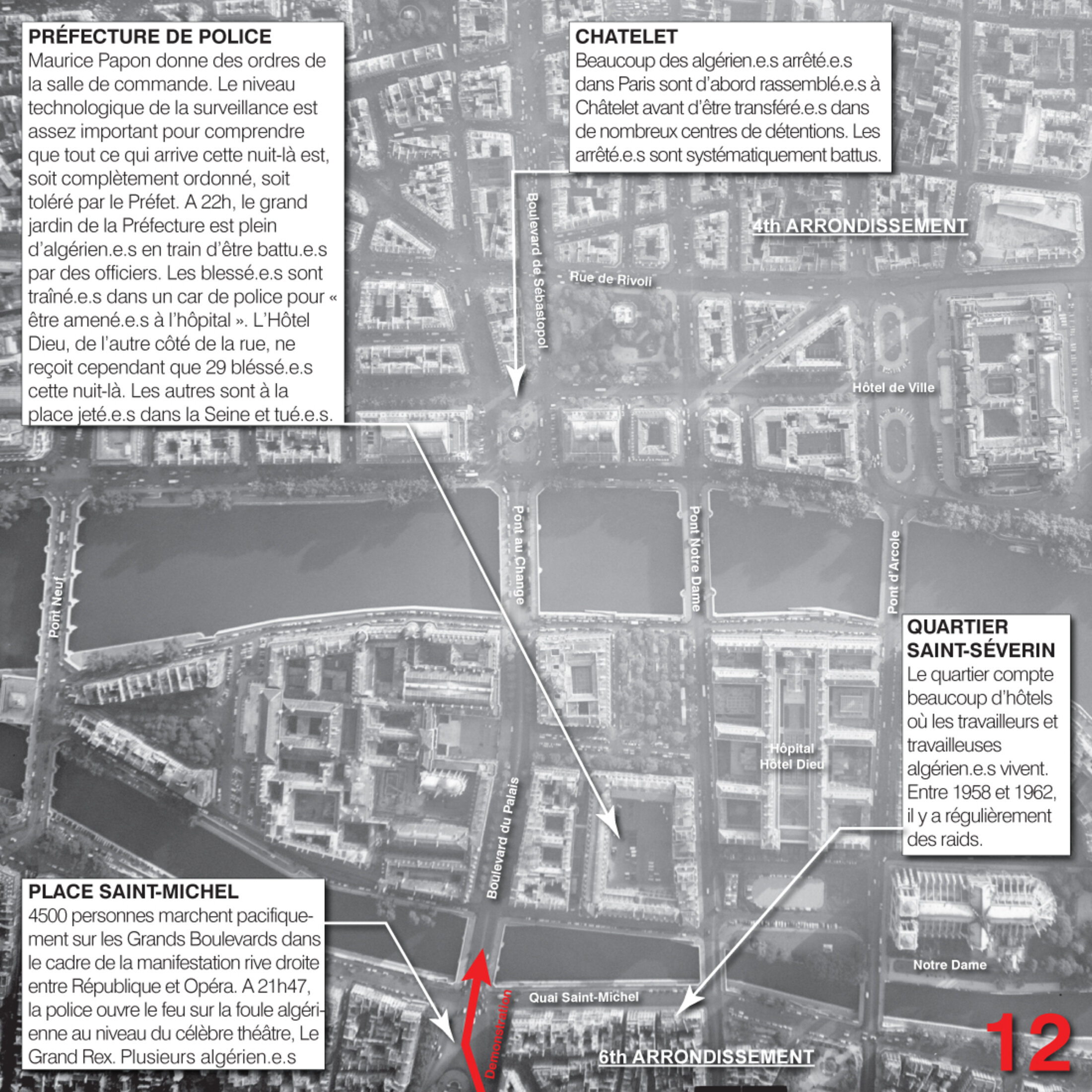 Le 3 octobre 2019, un employé de la préfecture de police de Paris a tué quatre de ses collègues avec un couteau pour des raisons qui ne sont pas entièrement connues pour le moment. Cette incertitude sur les causes n’a pas empêché le président Macron et son ministre de l’Intérieur, Castaner, de lancer une féroce campagne islamophobe présentant tout musulman·e pratiquant·e en France comme un·e terroriste potentiel·le qui doit être dénoncé·e sur la base de signes aussi bénins que la barbe ou le refus de faire la bise à un·e collègue. Dans son article relatant les assassinats des quatre fonctionnaires, le journal Le Monde écrivait : « Jamais depuis la fin de la Seconde Guerre mondiale, la cour de la préfecture n'a vécu un événement aussi sanglant. » Le journaliste était peut-être de bonne foi lorsqu'il a écrit ceci , mais si tel est le cas, cela prouve l'étendue de l'ignorance des français blancs en ce qui concerne le massacre du 17 octobre 1961, de nombreux Algérien·ne·s arrêté·e·s à proximité de la préfecture ayant été amenés dans la cour et systématiquement battu·e·s (parfois jusqu'à la mort) avec des matraques (voir la carte 12 ci-dessous).