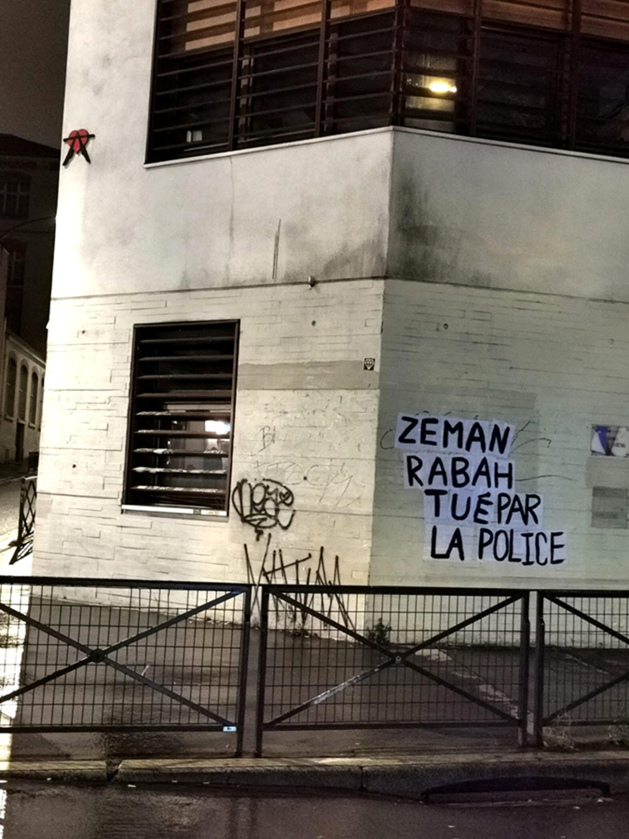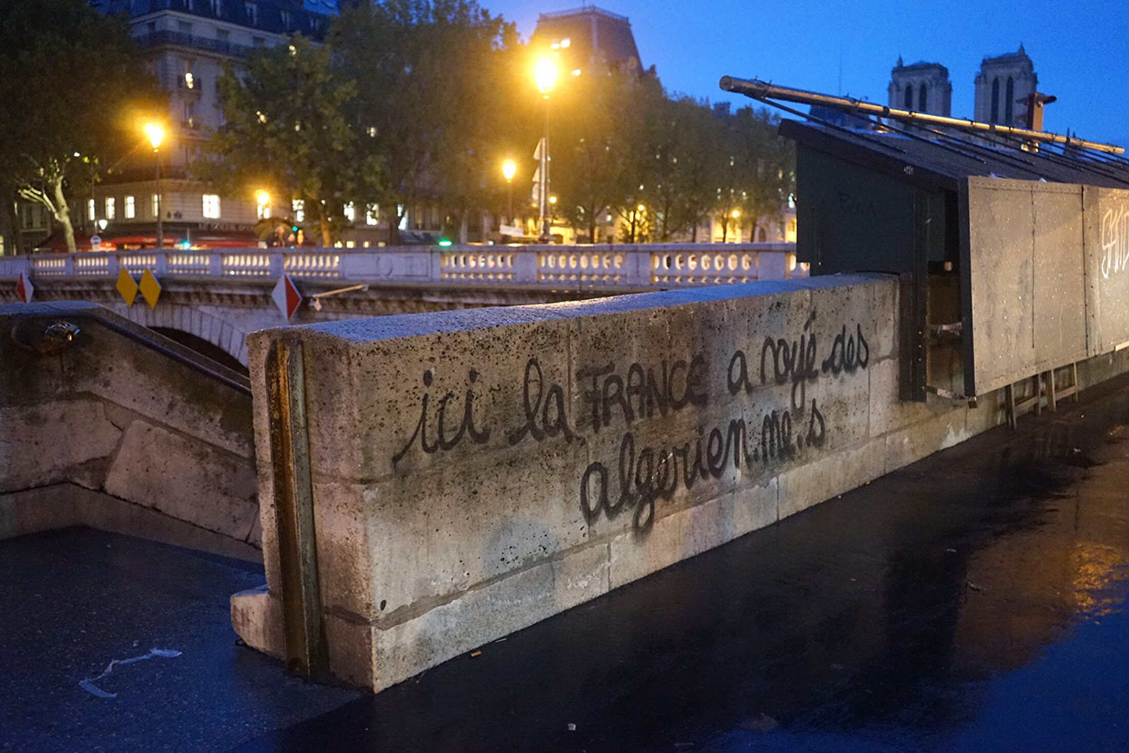 Hier soir, à quelques heures de la commémoration du 58e anniversaire du massacre, un petit groupe de militantes s'est rendu dans plusieurs de ces espaces pour y graffer ou coller les noms de certains des Algérien·ne·s tués cette nuit-là. Dans un environnement policier et fasciste particulièrement intense, elles ont réussi à rendre un hommage à l'histoire de la résistance algérienne (qui se poursuit encore aujourd'hui grâce au militantisme antiraciste et anticolonial), allant au-delà du cadre autorisé (bien que très important) du Rendez-vous annuel de 18h sur le pont Saint-Michel. Ceci est crucial car les efforts officiels très discrets de reconnaissance du massacre par la municipalité de Paris et l'État français ne ciblent jamais ceux qui en sont responsables (Papon, bien sûr, mais également le gouvernement de Gaulle-Debré et les policiers eux-mêmes). Comme l'ex-maire de Paris, Bertrand Delanoë, l'a déclaré lui-même le 17 octobre 2001, lors de la pose d'une petite plaque commémorative officielle du côté du pont Saint-Michel : "Cette plaque ne vise personne" (il disait cela pour apaiser une droite furieuse mais il avait raison : elle ne cible pas les responsables). Nous avons été heureux d’apprendre que les cartes conçues pour l’article cité ci-dessus avaient été utiles aux courageuses activistes qui avaient entrepris cette action. Nous publions ici les images de leur action courageuse et inspiranteen association avec ces cartes pour insister sur la signification historique de chacun des lieux qu'ils ont visités.