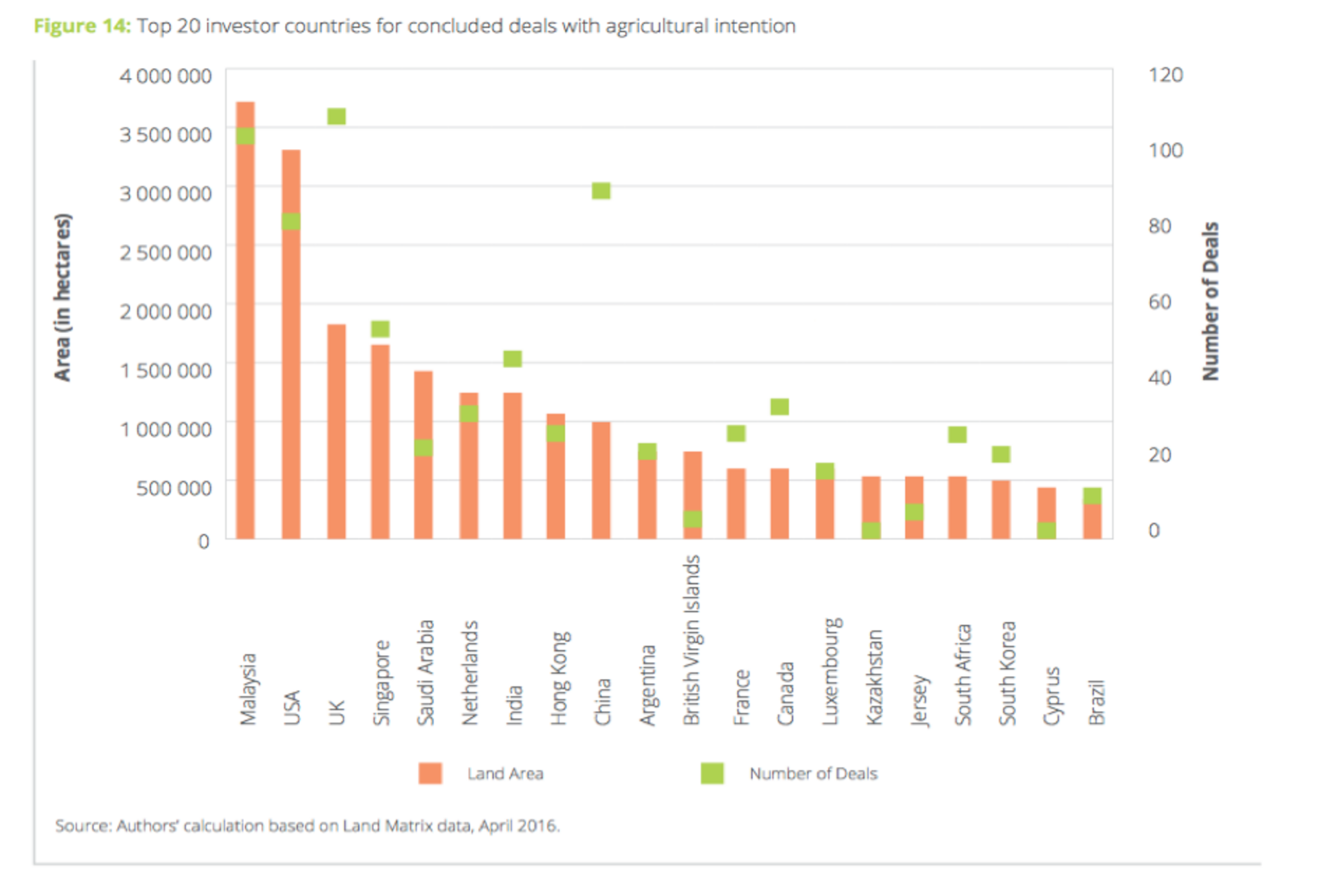 L’Afrique est devenue le continent le plus convoité (10 millions d’hectares sur la période 2000-2016), mais aussi l’Europe de l’est (5,1 millions), l’Asie (5 millions) et l’Amérique du sud (4,5 millions). Ces acquisitions sont le fait de capitaux en provenance surtout de la Malaisie (3,7 millions d’hectares), des États-Unis (3,3 millions) et de la Chine et Hong Kong (1,9 million), du Royaume-Uni (1,7 million), de Singapour (1,4 million), de l’Arabie saoudite (1,4 million).[1]