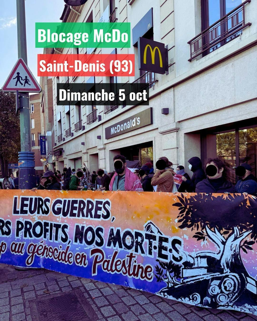 Dimanche 5 octobre, plusieurs groupes aux couleurs de la Palestine font irruption depuis les allées du marché de Saint-Denis pour bloquer le McDo. Une cantine s’installe devant les portes, les drapeaux sont de sortis, la sono crache les tubes et les slogans s’enchainent pendant plus de 3 heures. On bloque les complices, pour briser le blocus !