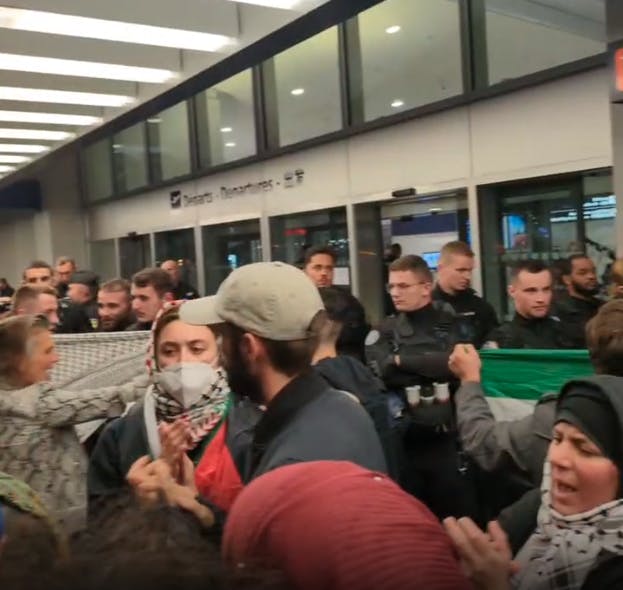 Une centaine de personnes se sont rassemblées à l'aéroport Charles de Gaulle dans le terminal d'où un avion civil partait pour Jérusalem transportant un colis de composants destinés au fabricant d'armes israëlien Elbit Systems avant d'être repoussées par la police.