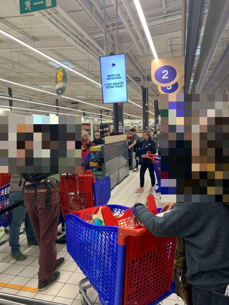 À 20, nous avons bloqué quelques caisses pendant 30 minutes (et 1 caddie = 1 heure de rangement). Soyons plus nombreux.ses la prochaine fois pour cette action qui peut vraiment faire perdre du chiffre d'affaires à ces grands magasins complices du génocide, qui gavent leur actionnaires et détruisent les petits commerces. ✊