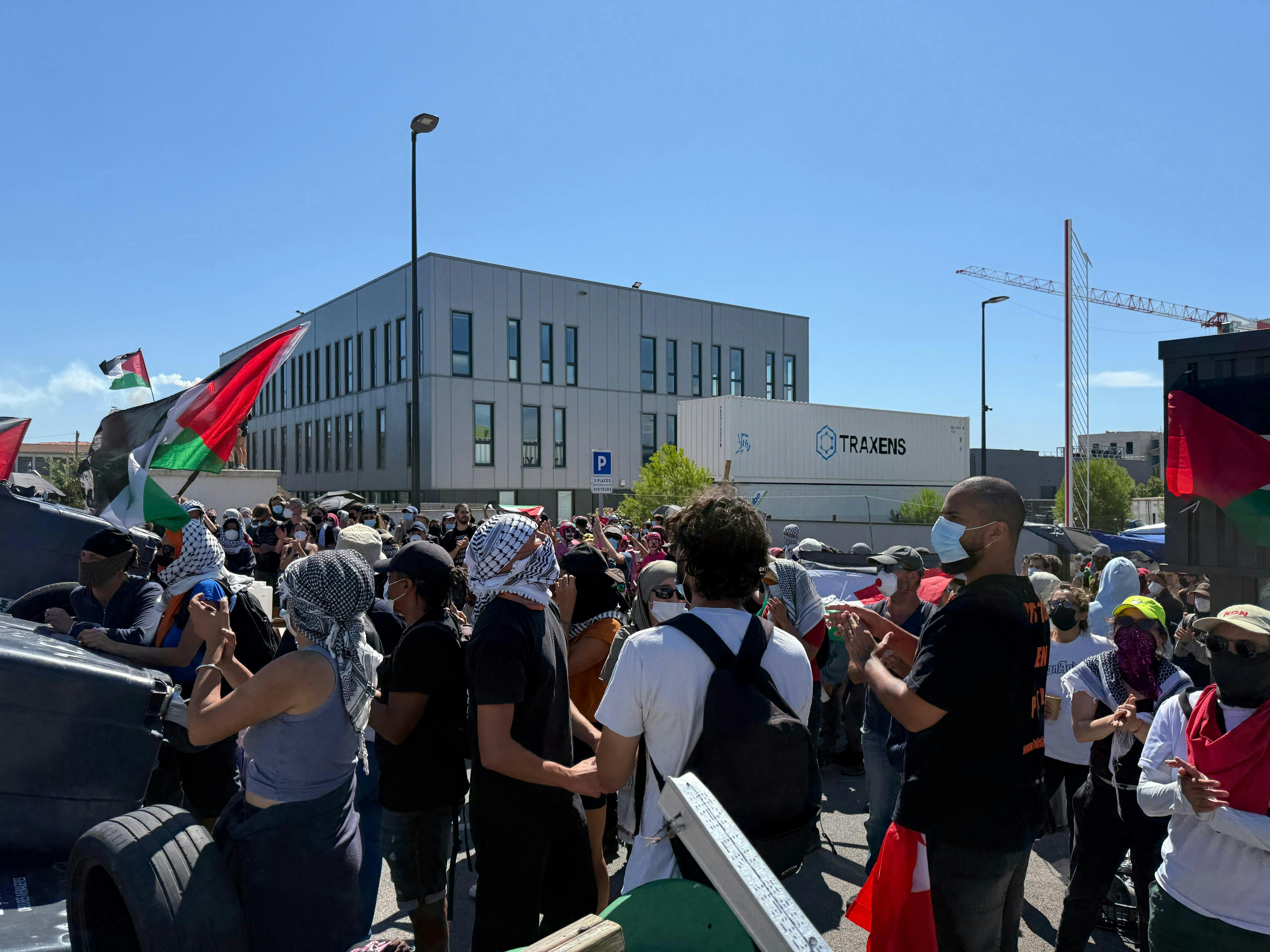 Pour la troisièmle fois en moins d'un mois, à Marseille, l'entreprise Eurolinks qui fournit des armes pour l'armée coloniale a été bloquée. La manifestation a malheureusement fini nassé et 120 personnes ont été interpellées