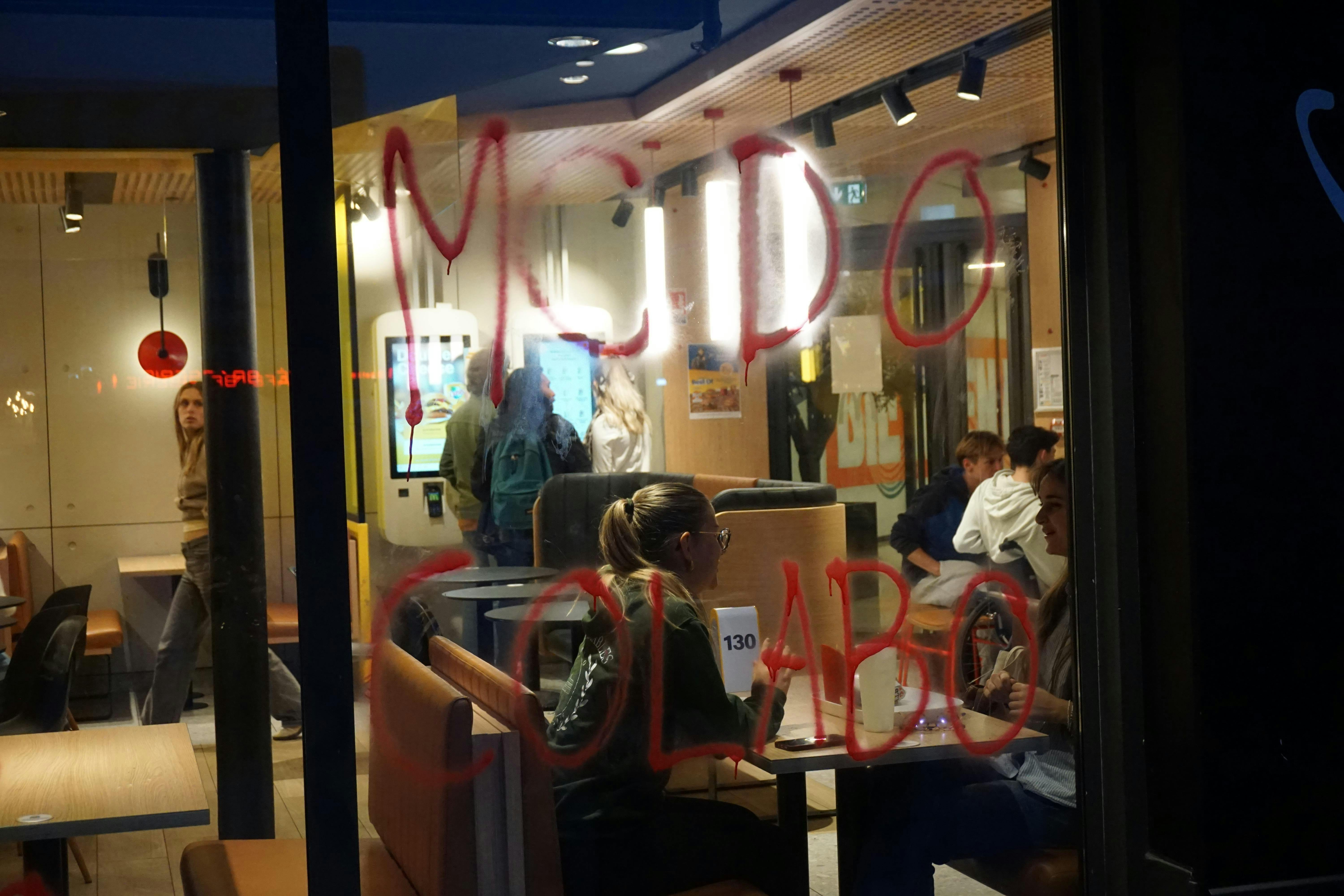 Ça commence donc par ce méga drapeau déployé sur République. 1500/2000 personnes en manifs. Beaucoup de crs qui serent fort les manifestants. Malgré cela 150 personnes réussissent à rejoindre le mac do sur la place du Colombier. Ça tag: "mac do collabo", "free palestine". Ça met des coups de pieds et une vitre tombe de peur. Puis dispersion et à nouveau manif sauvage. Un carrefour prend aussi des coups.