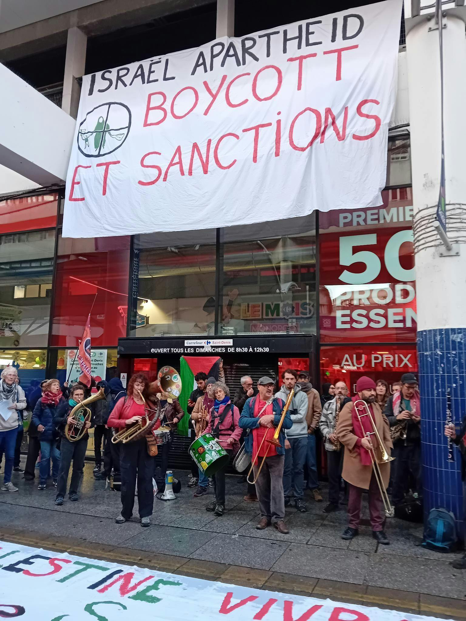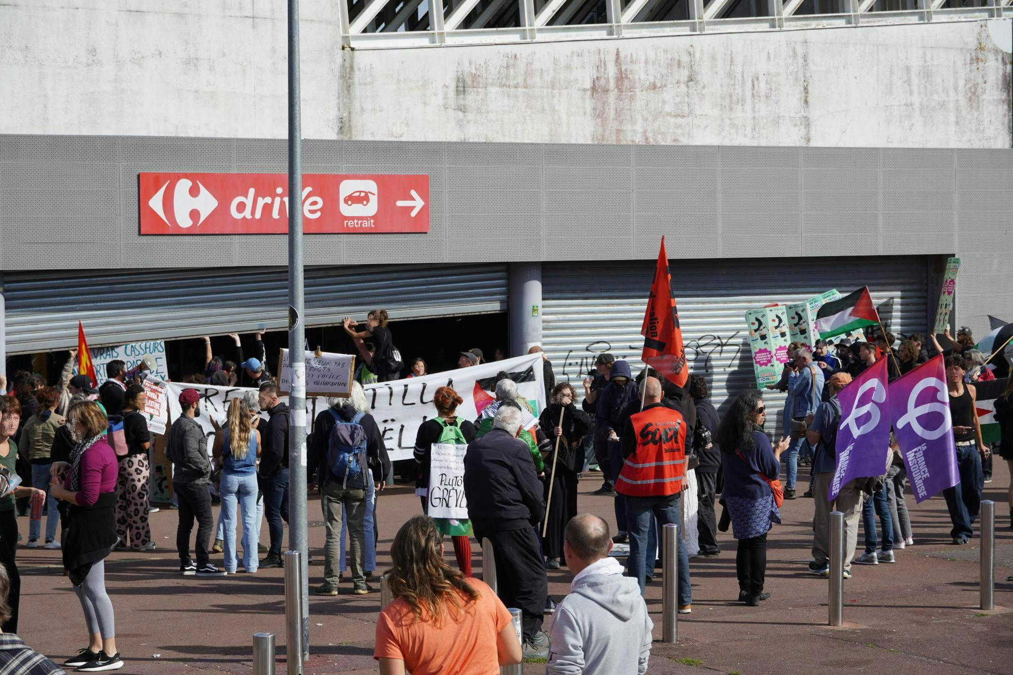 Pour dénoncer l’hypocrisie d’un gouvernement qui reconnaît un État de Palestine et ne fait rien pour protéger les PalestinienNEs, ni ceux et celles qui leur viennent en aide, ne prend aucune sanction contre les agresseurs mais aussi pour dénoncer les entreprises complices d'Israël comme Carrefour, une action a conduit à la fermeture du Carrefour à la suite de la mobilisation pour la justice sociale, fiscale et environnementale.